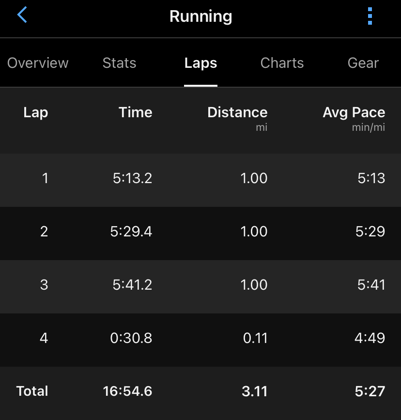 Ran two 1.5 mile intervals @ 5:28 mile pace.