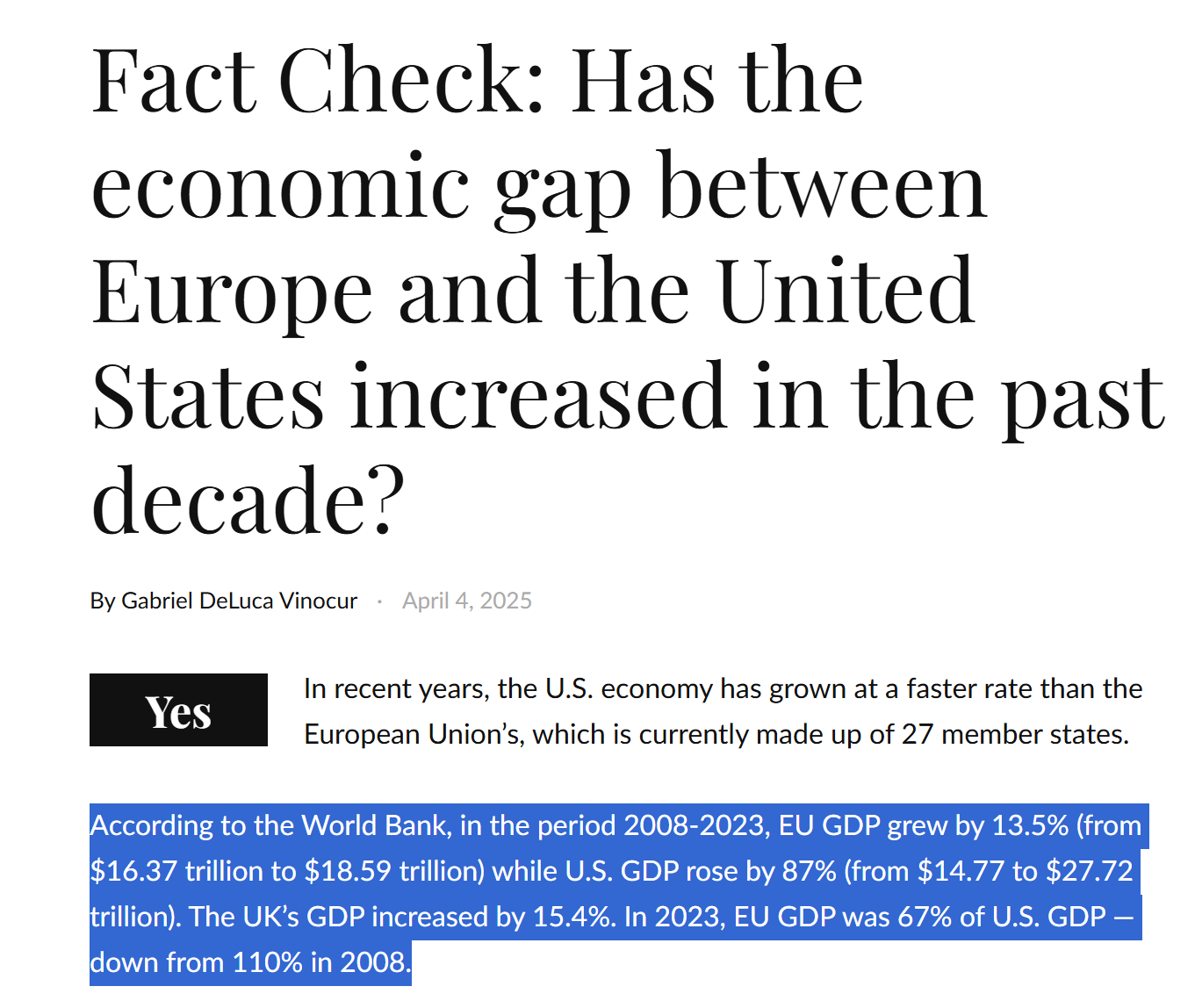 edit: quickl googles give me Europe total GDP of about $28trn, with U.S. in the $29-30trn range. (I wonder how much of that is healthy growth in Eastern European countries)