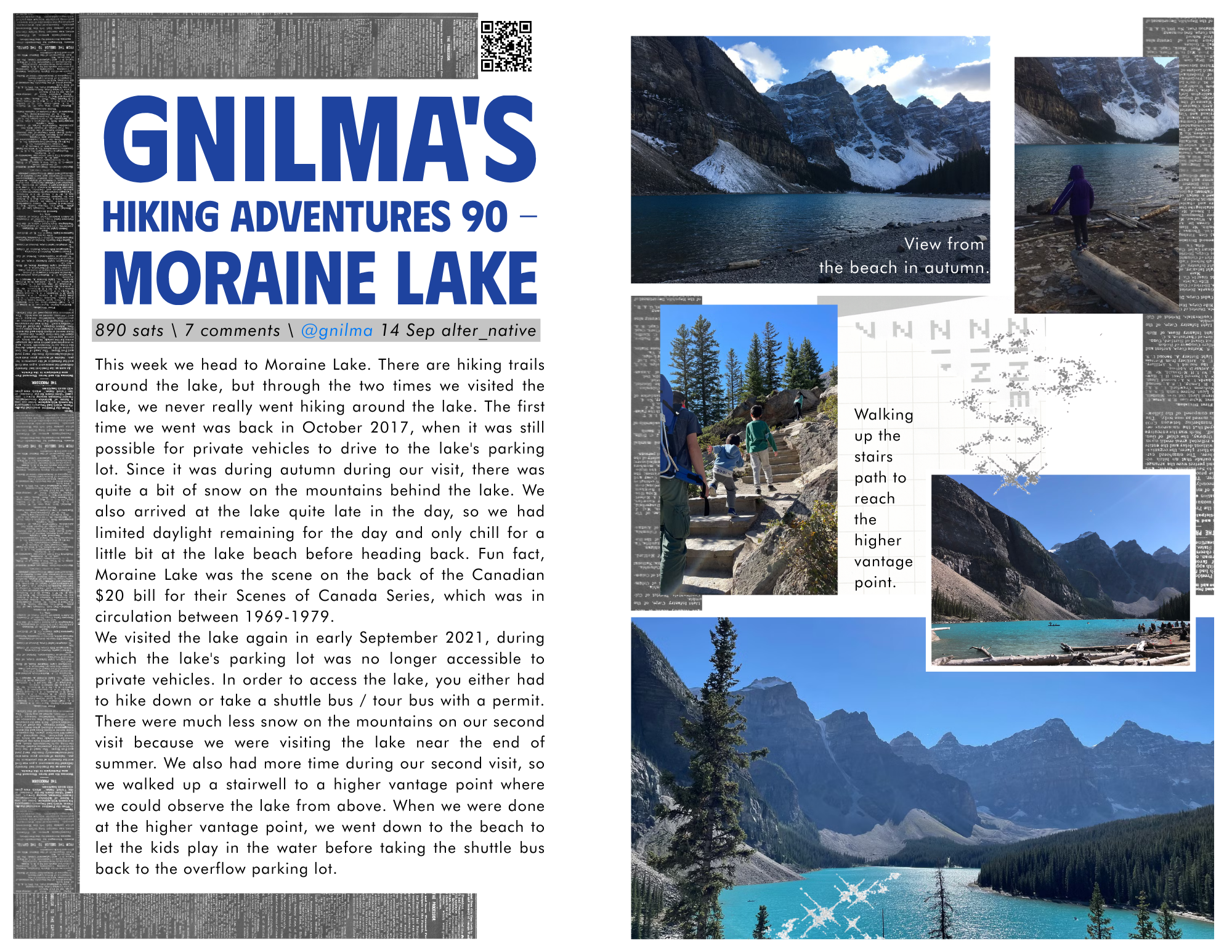 This week we head to Moraine Lake. There are hiking trails around the lake, but through the two times we visited the lake, we never really went hiking around the lake. The first time we went was back in October 2017, when it was still possible for private vehicles to drive to the lake's parking lot. Since it was during autumn during our visit, there was quite a bit of snow on the mountains behind the lake. We also arrived at the lake quite late in the day, so we had limited daylight remaining for the day and only chill for a little bit at the lake beach before heading back. Fun fact, Moraine Lake was the scene on the back of the Canadian $20 bill for their Scenes of Canada Series, which was in circulation between 1969-1979.