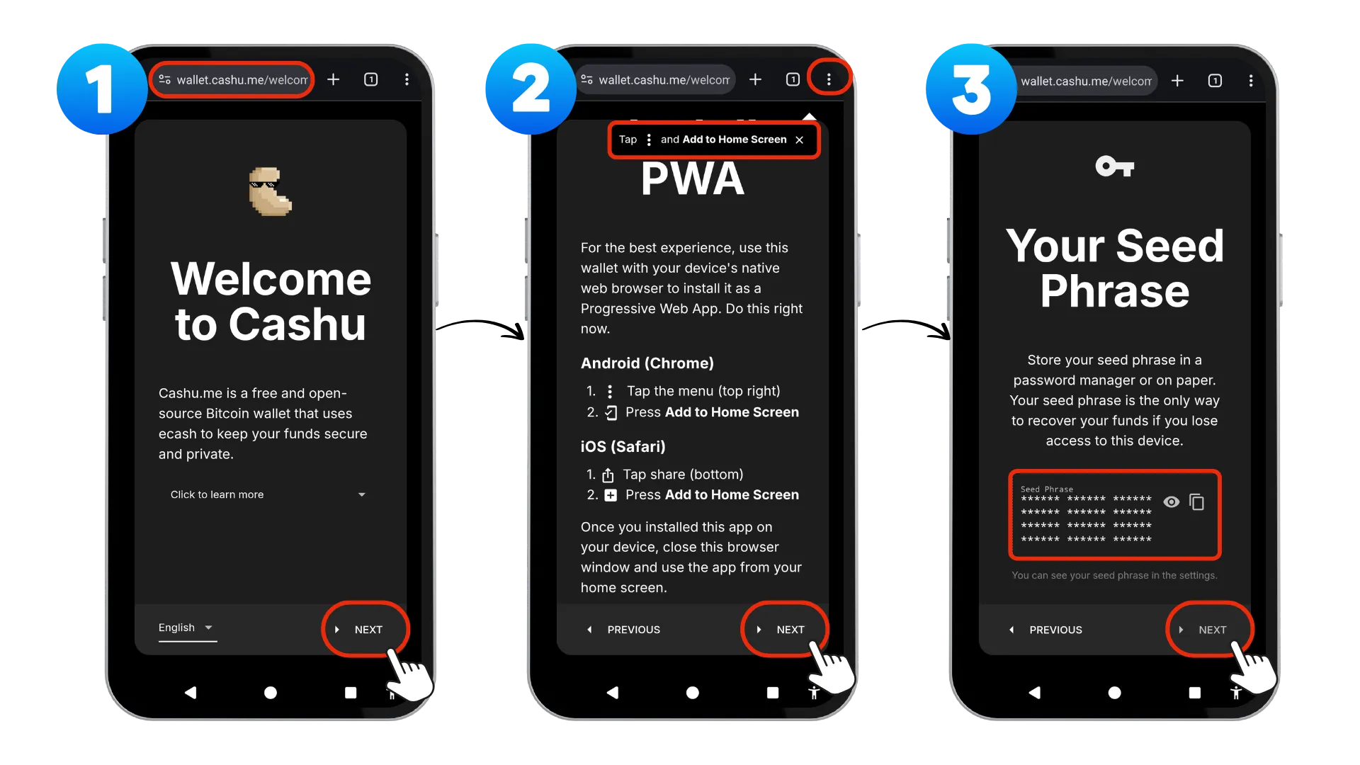 . Once installed, close the browser tab and launch Cashu.me from your device's home screen. On the welcome screen, tap Next