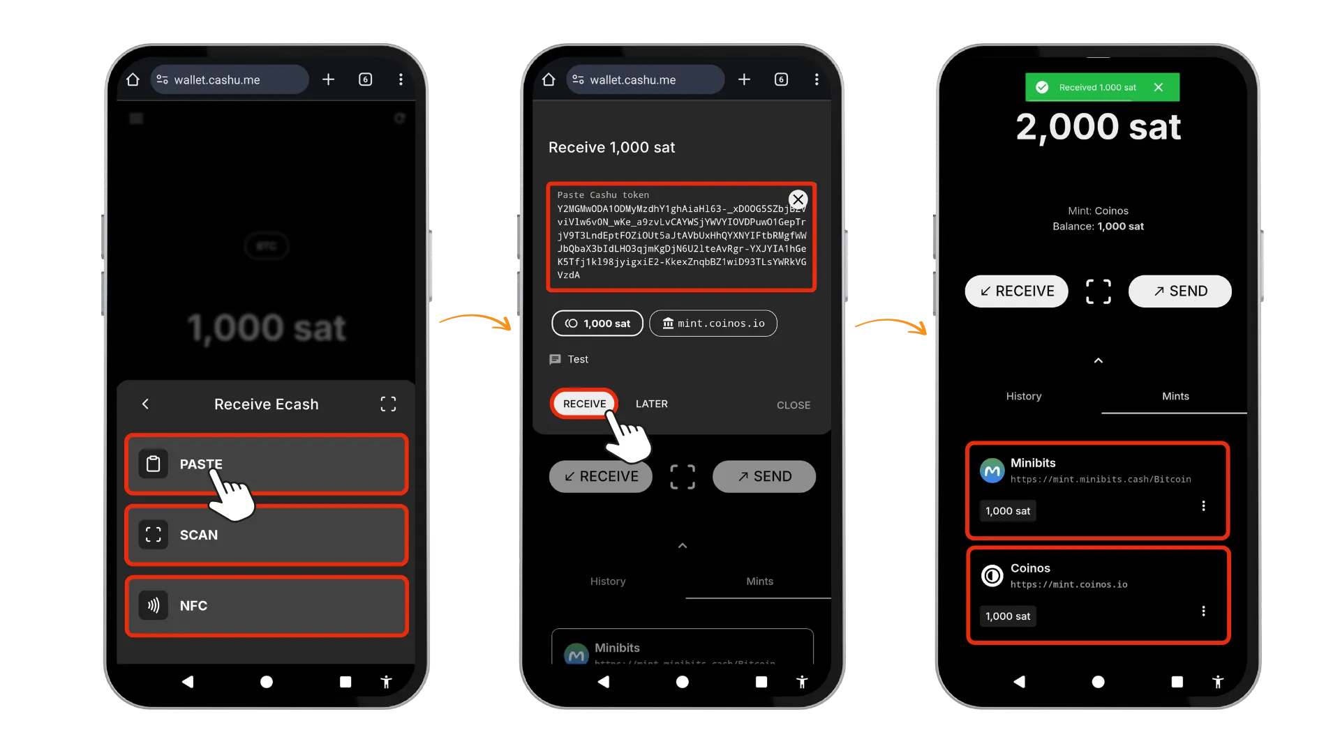 to submit a Cashu token from another wallet. If you choose to paste, enter the token string you've copied from another wallet, the Amount
