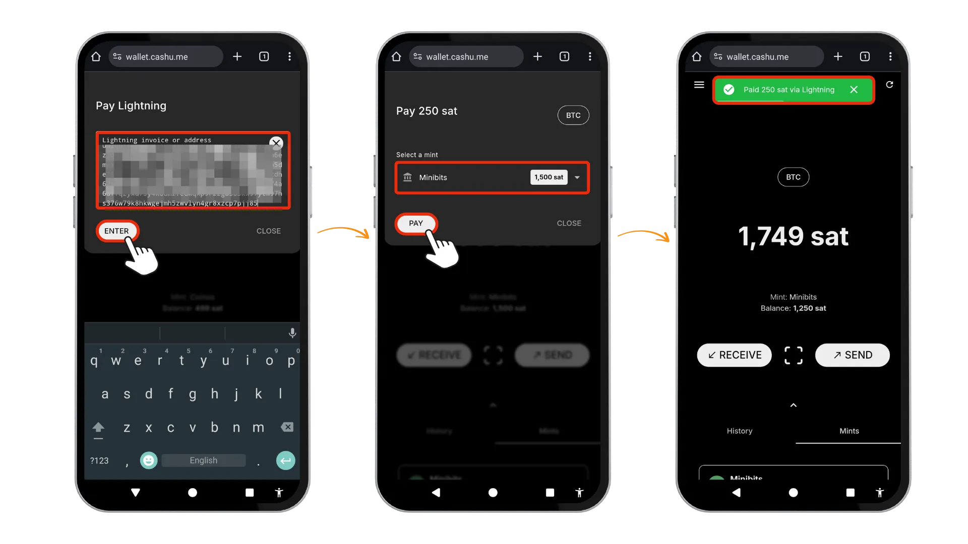 which allows you to pay invoices from multiple mints at once. - After successful completion, you'll see payment confirmation and the amount deducted from your balance.