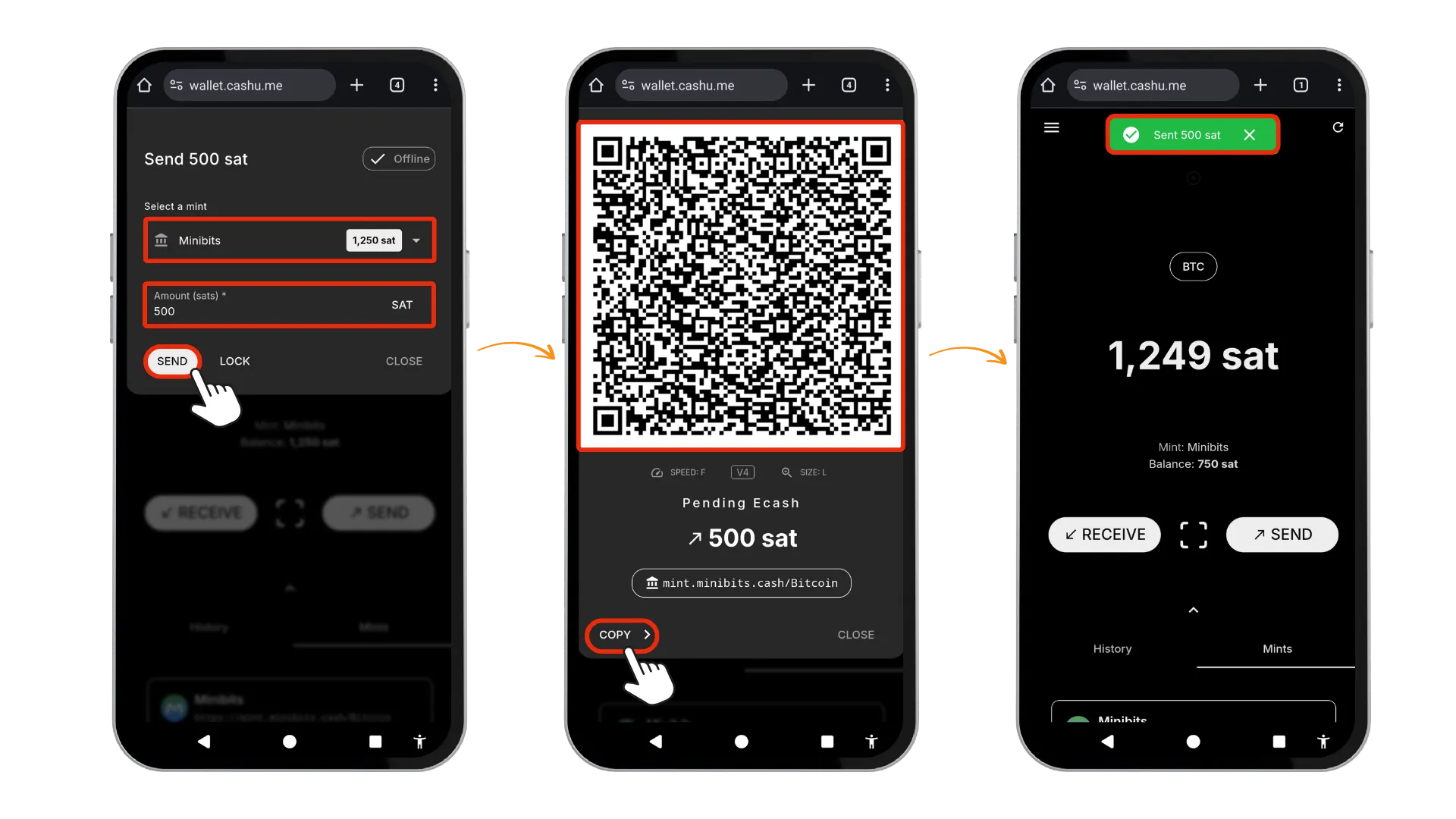 - Offline ecash: Send/receive tokens through a local transmission protocol, like NFC, QR code, Bluetooth, etc. without internet connection
