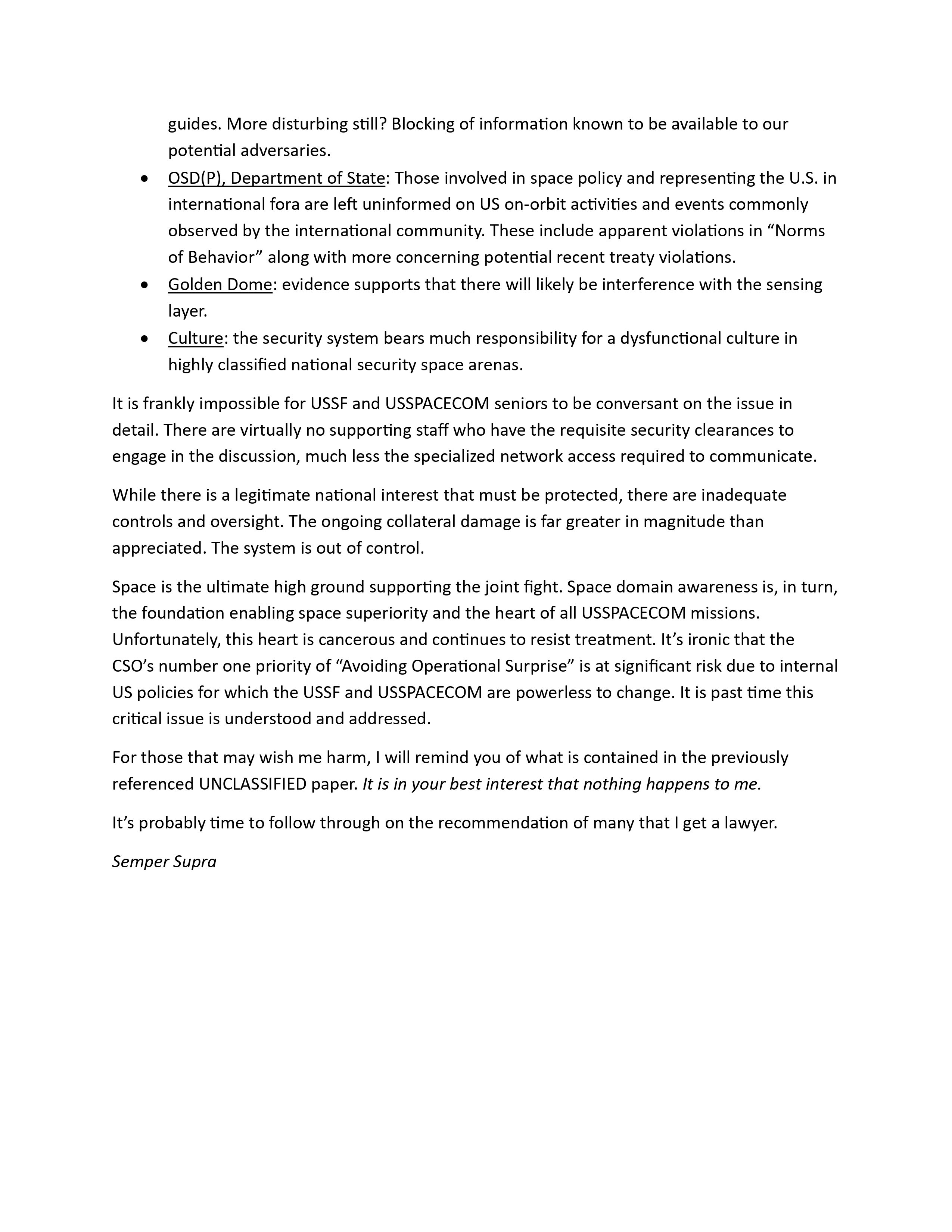 - A security control system is supplanting the direction and authority of the US Space Force and USSPACECOM (high confidence).