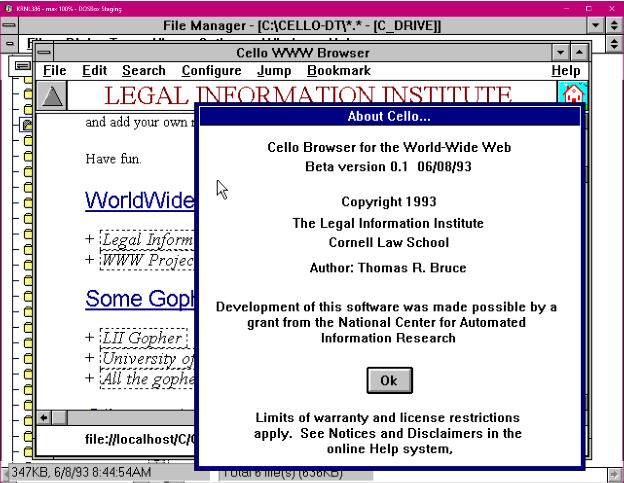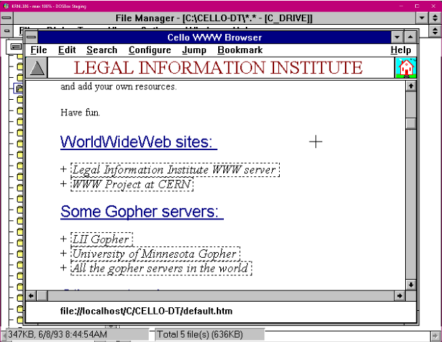 Cello was created at Cornell Law School so that lawyers could access their legal website from Windows computers. My team mate, Molly, was able to download the 0.1 beta for me, and we were shocked by what we found: