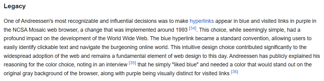 In the changelog for Mosaic for version 0.13, there is one bullet that is of great importance to us:Changed default anchor representations: blue and single solid underline for unvisited, dark purple and single dashed underline for visited.--Release Notes In the immortal words of Jeff Goldblum’s Ian Malcom character in Jurassic Park, “Well, there it is.”June 8, 1993 – Cello Beta