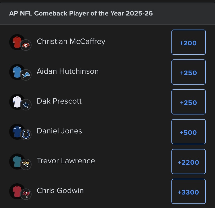 Will Christian McCaffrey win Comeback player of the Year https://beta.predyx.com/market/nfl-will-christian-mccaffrey-win-comeback-player-of-the-year-1759515569
