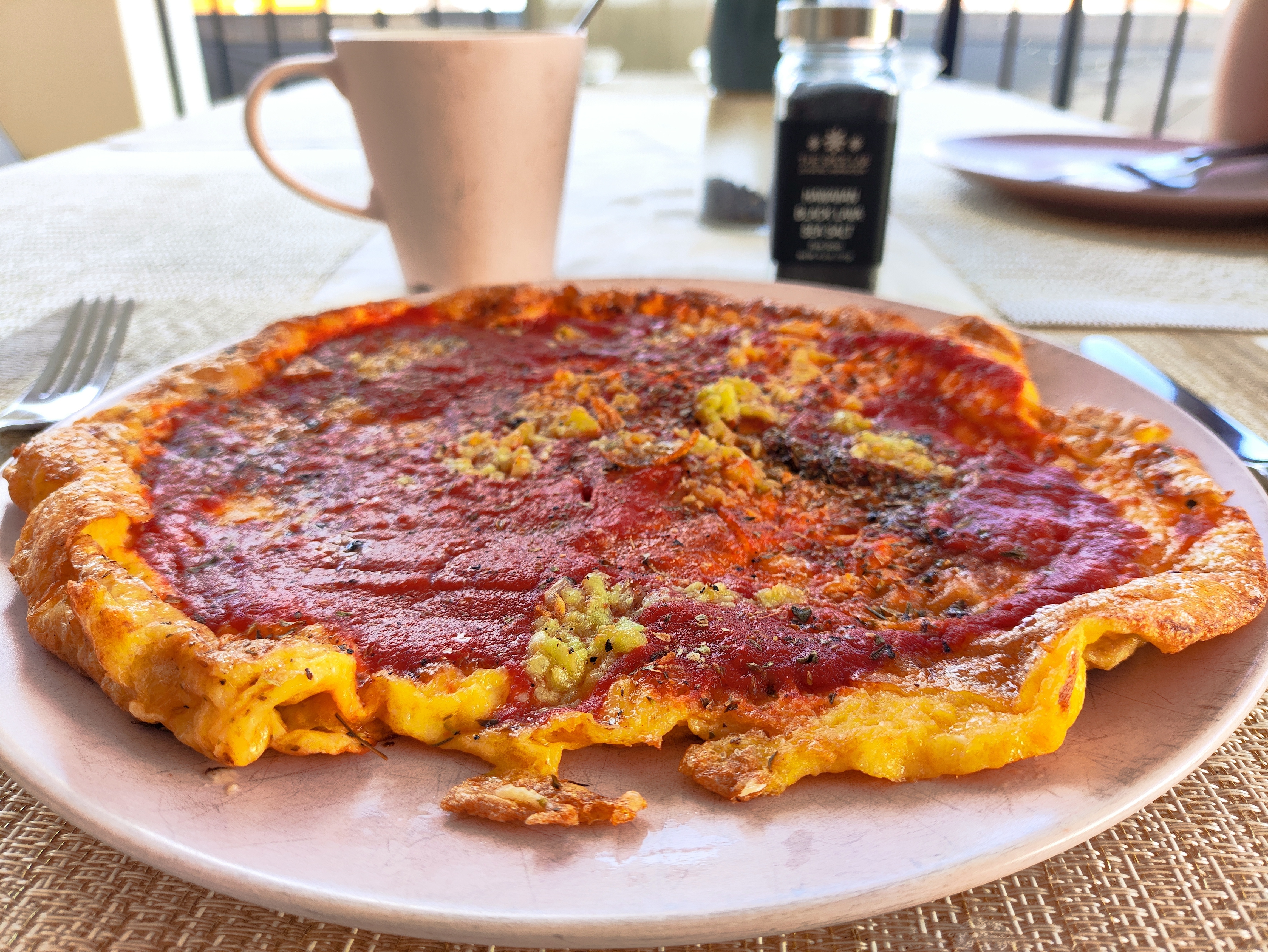 Egg Omelet Based Pizza Marinara w/ Fresh Garlic Butter & Black Hawaiian Sea Salt
