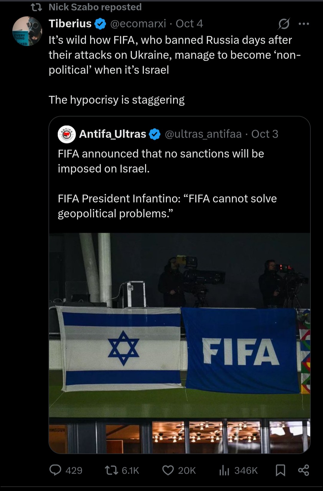 All this organizations works together in the same direction. Anyway, the Israeli team is not notable for being horrible. Jokes aside, FIFA has for years been making decisions worthy of a state authority. They don't deserve the attention and power they have.