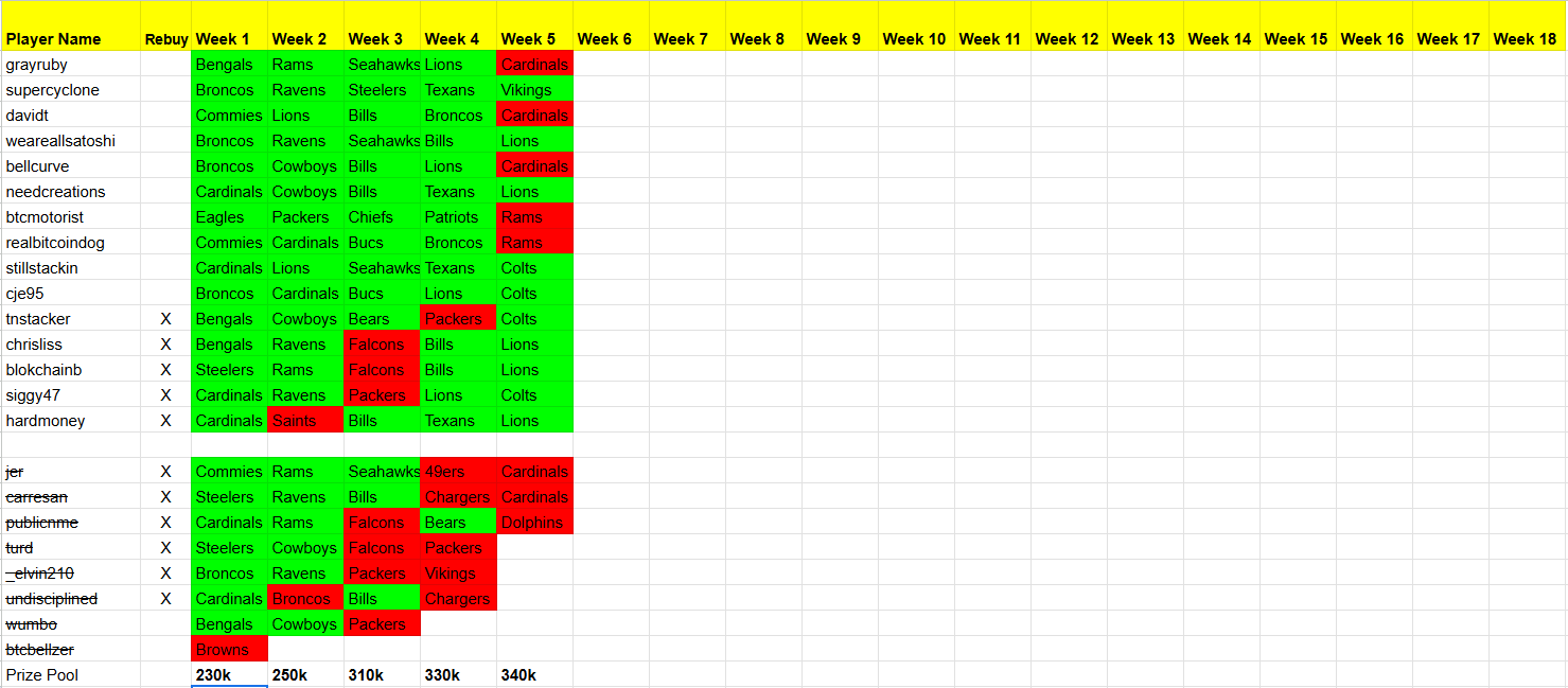 I think we need to add in some kind of further futility measurement beyond simply losing to really give people a chance who aren't knocked out week 1 because if you get knocked out week 1 it is probably better to start picking losers than to rebuy.
