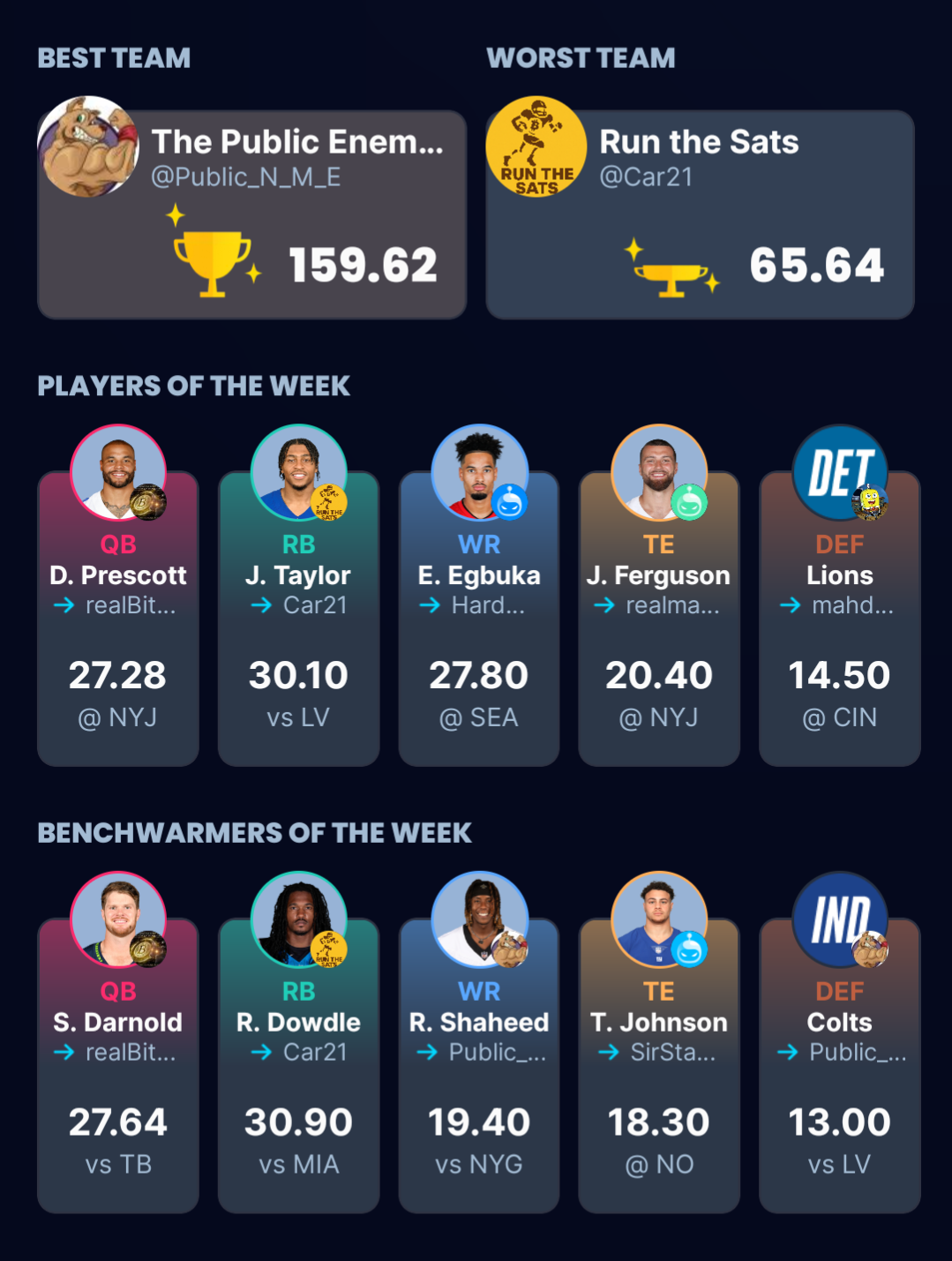 Congratulations to all those who won their matchups and commiserations to those who didn't. Fantasy Football is a cruel mistress.
