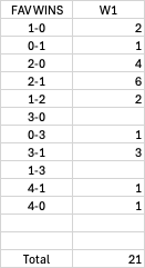 In 21 out of 39 matches, the favorites won the matchup. Almost a 30% of these results were 2-1. Around a 20% ended up 2-0 and just a 10% the away team won 1-2. Combining the 2-1 and 1-2 results, a 40% of matches ended up with these results.