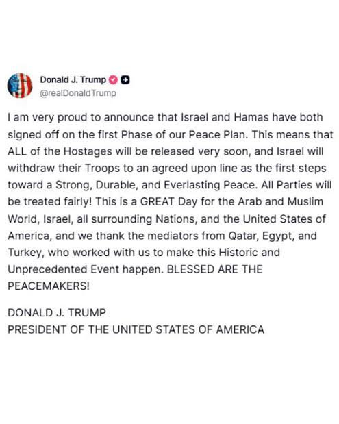 It'll be interesting to see if both parties can remain restrained and follow the peace deal. This isn't the first time Trump's announced it. #1013858