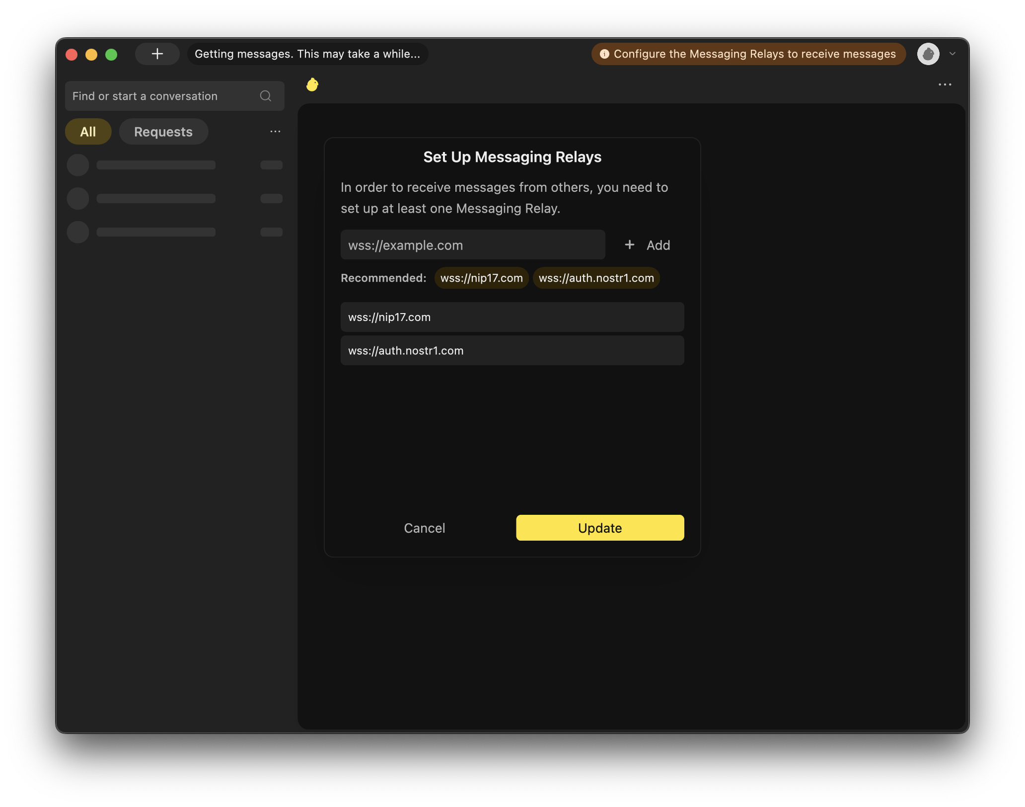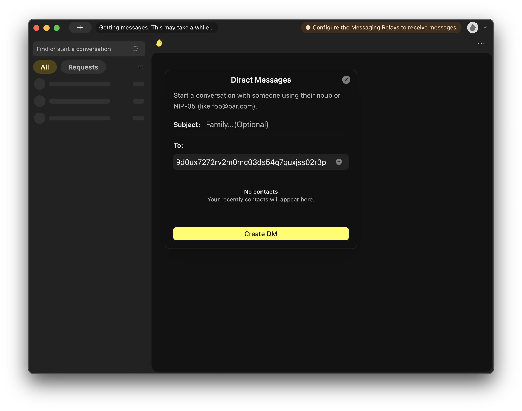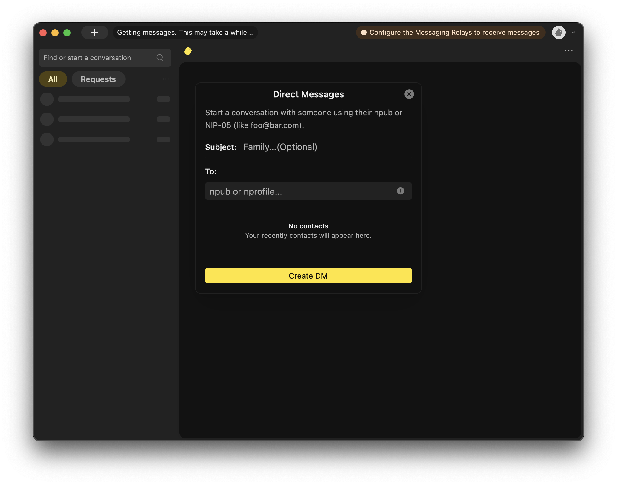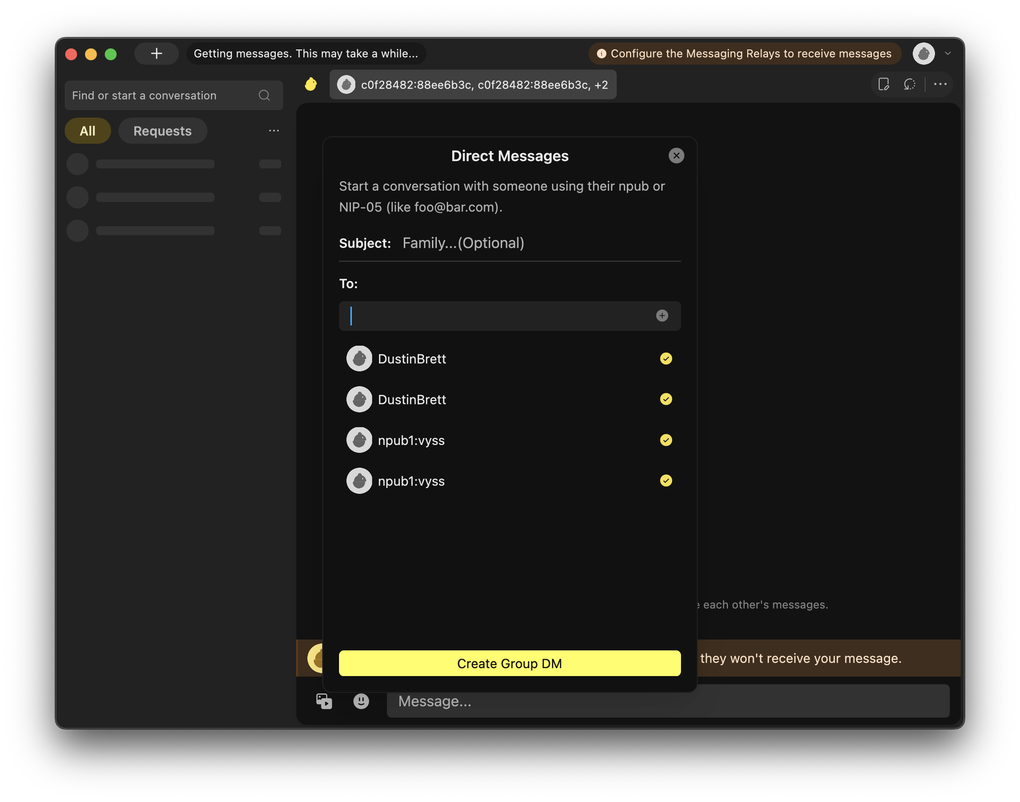 This is a desktop client for private messages, works fluently, and surprisingly, it has support for group chat! It leaves Whitenoise behind on this. Tested on macos: