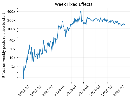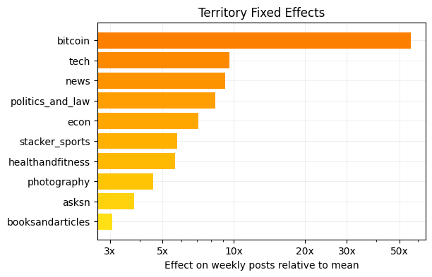 . It captures an arbitrarily flexible time trend in Stacker News's overall popularity. This helps us deal with things changing over time, such as SN's decision to go non-custodial, or other side-wide factors that could influence the number of posts.With these two fixed effect vectors, we control for any baseline differences in popularity between territories, and we control for any common time trends in SN's overall popularity. The regression is identifying the relationship between post fees and number of posts based on changes in the posting fee within territories. So, the thought experiment is: "When a territory changes its posting fee by
