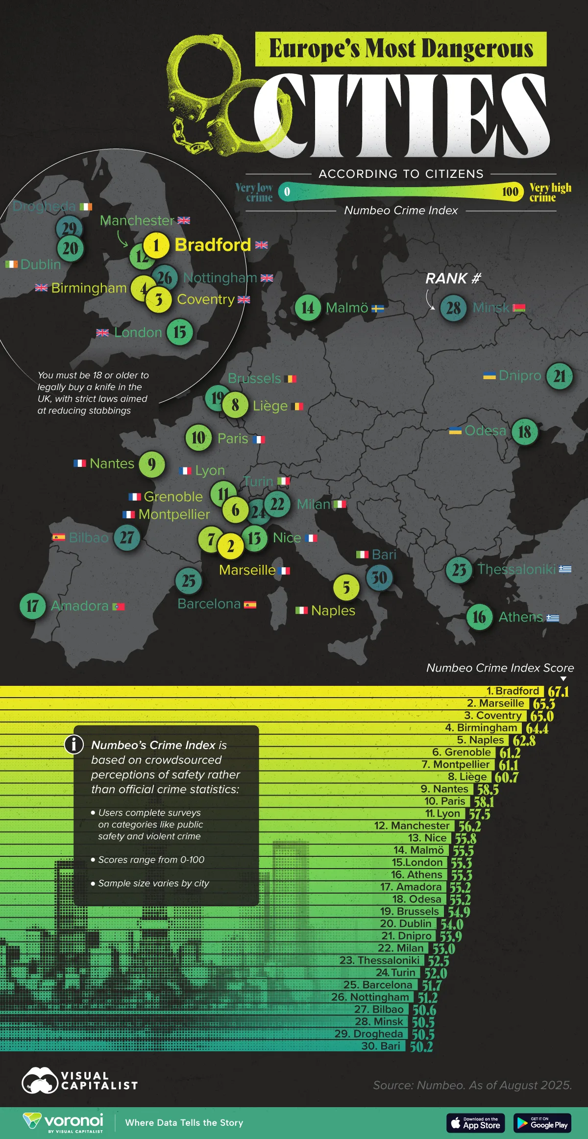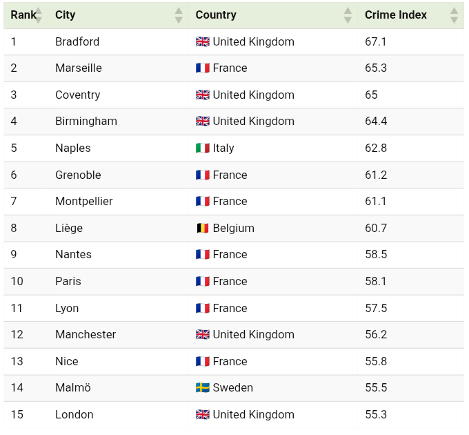 - Four of the top five cities — Bradford, Coventry, Birmingham, and London — are located in the United Kingdom. Bradford leads the list with a Crime Index of 67.1, the highest in Europe.