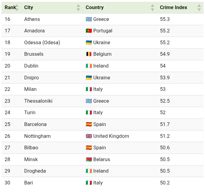 - France accounts for seven of the top 10 entries, including Marseille, Grenoble, Montpellier, Nantes, Paris, Lyon, and Nice. Despite their cultural and economic prominence, these cities report strong local concerns about petty theft, vandalism, and other poverty-related issues.