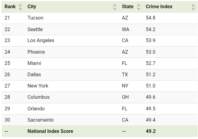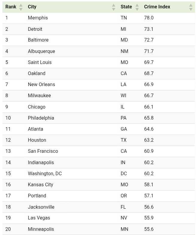 - Detroit (73.1) and Baltimore (72.7) continue to rank among the top three most dangerous cities in the index.