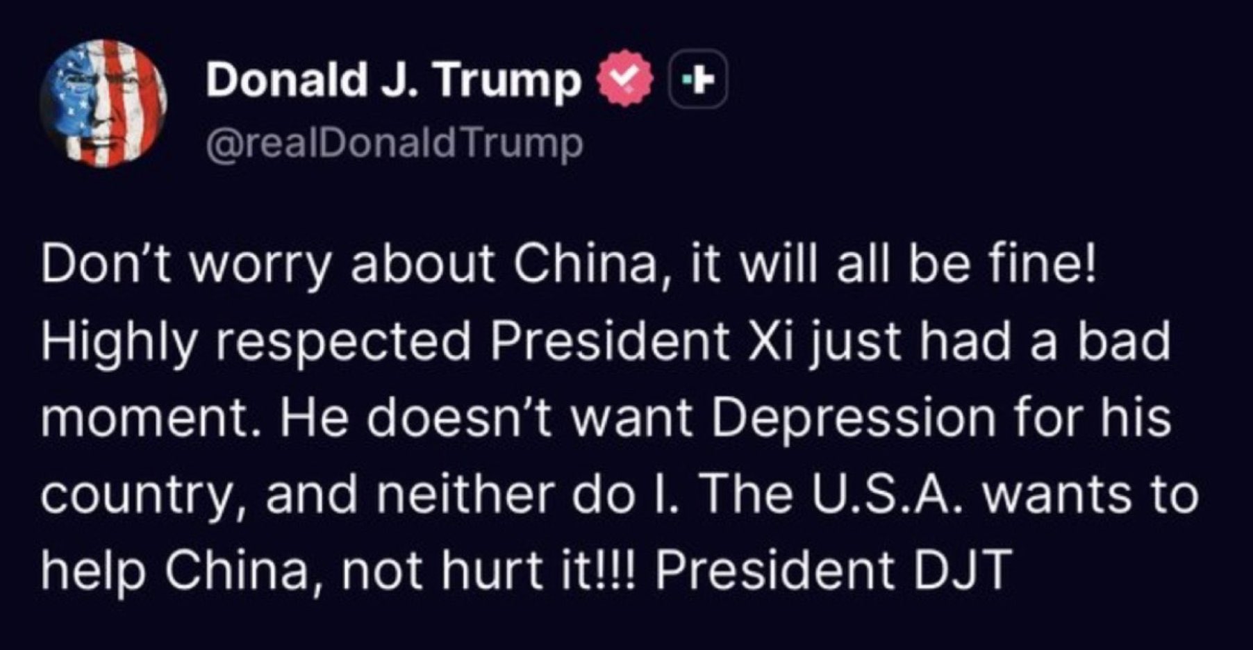 Trump posted that the US "wants to help China, not hurt it"—a clear gesture to defuse tensions.