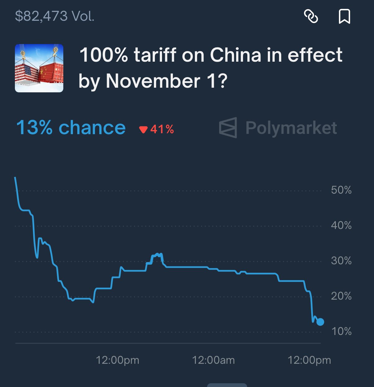 At Polymarket, the chance of a tariff being imposed plummeted to 13%—a 41% drop.