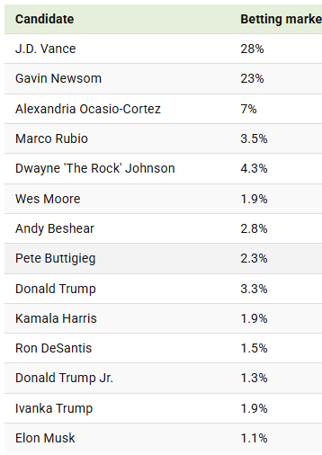Although the 2028 U.S. presidential race is just over three years away, betting markets are already sizing up candidates’ odds, including ineligible candidates like current U.S. President Donald Trump and Elon Musk.This visualization shows the current implied probabilities for the candidates of the 2028 U.S. Presidential election based on Polymarket data as of October 14, 2025.