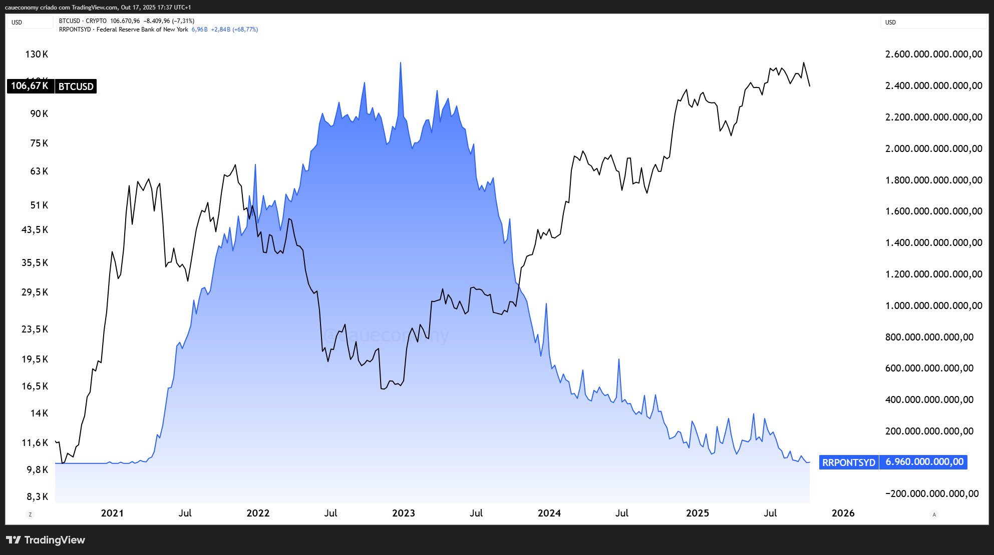 Since the end of 2022, Bitcoin has been rising even during quantitative tightening (QT), which seemed contradictory. But this rise was supported by positive liquidity—not coming directly from the Fed's balance sheet, but from other channels, such as the reverse repo program.