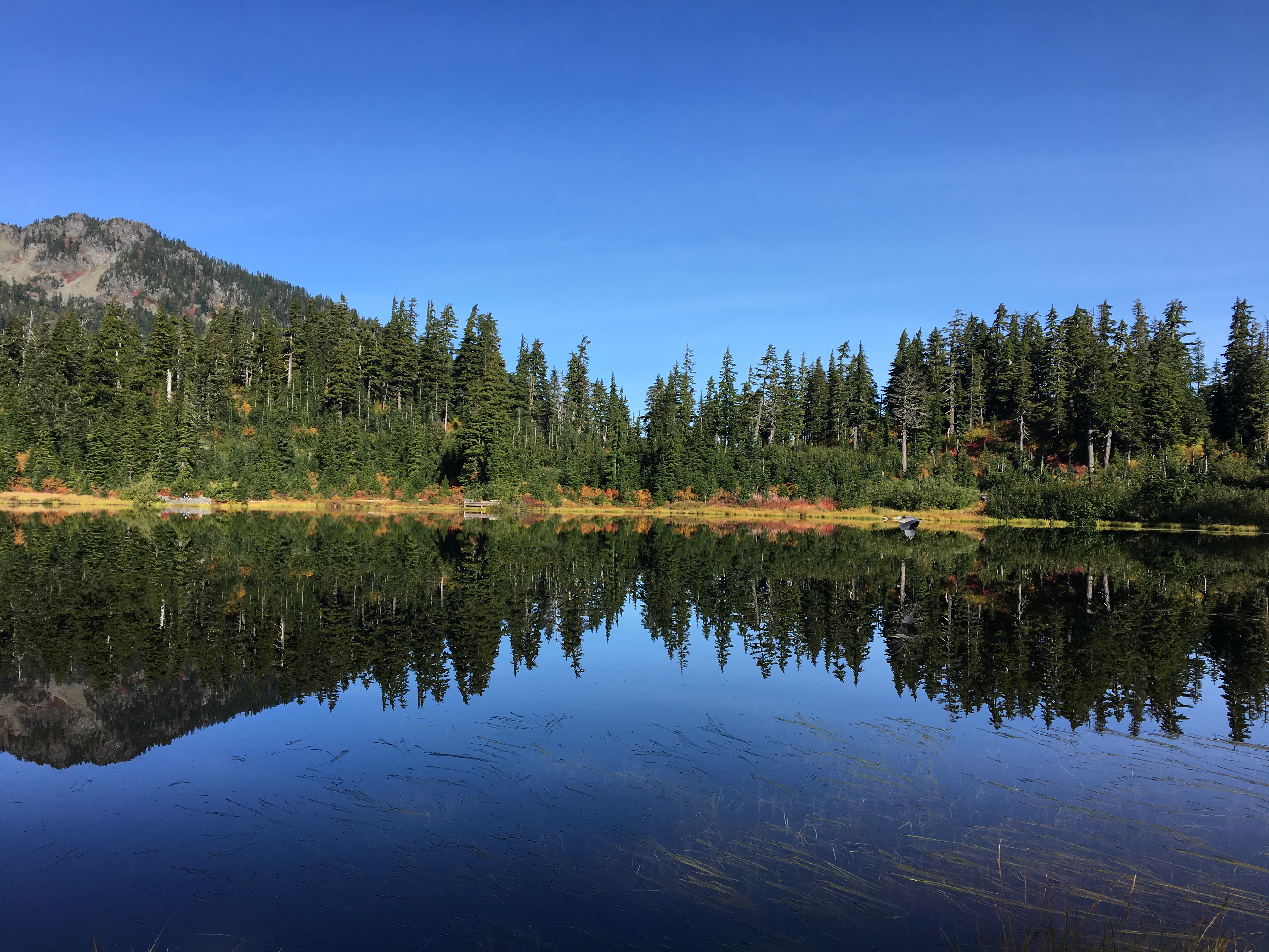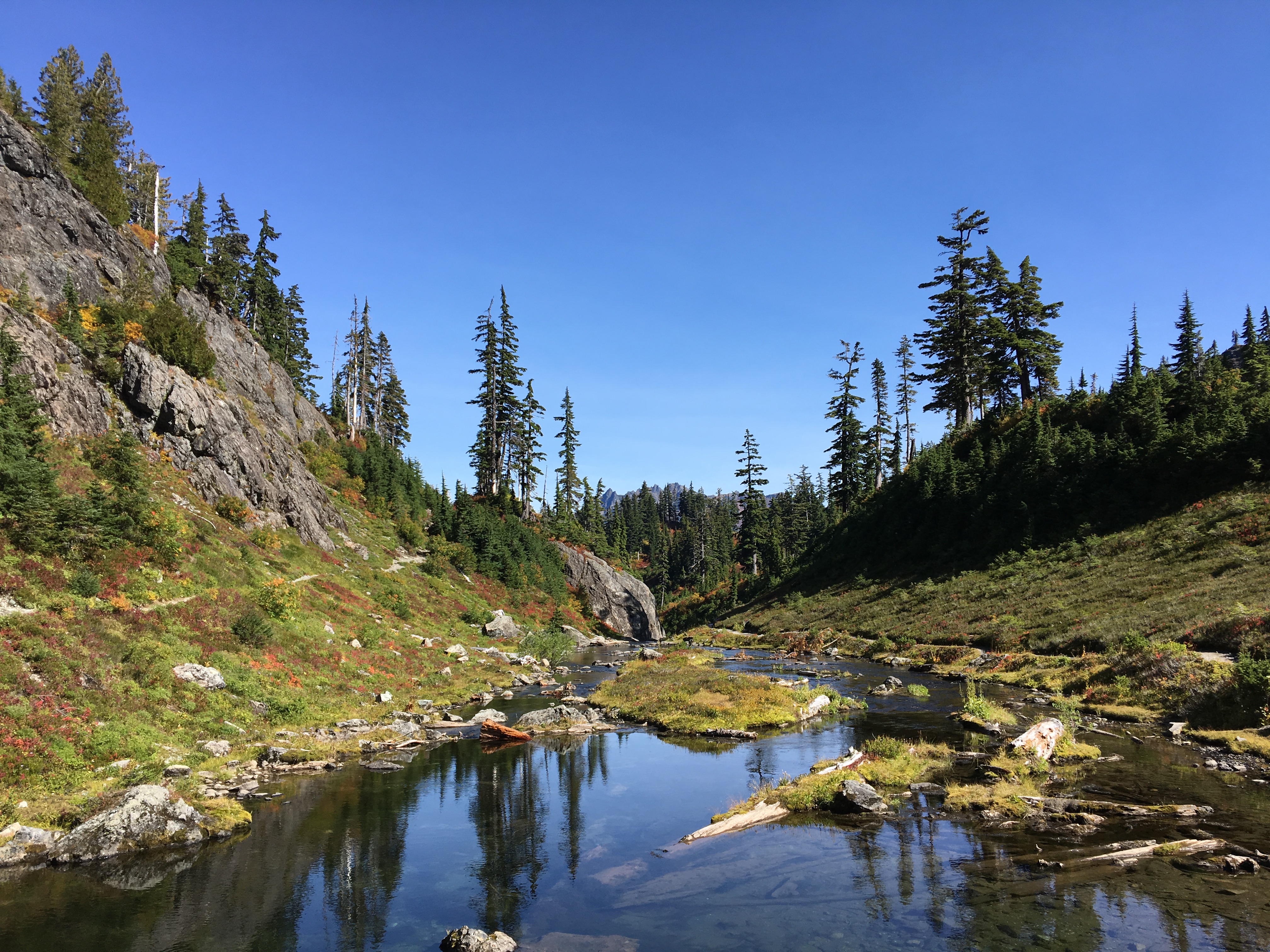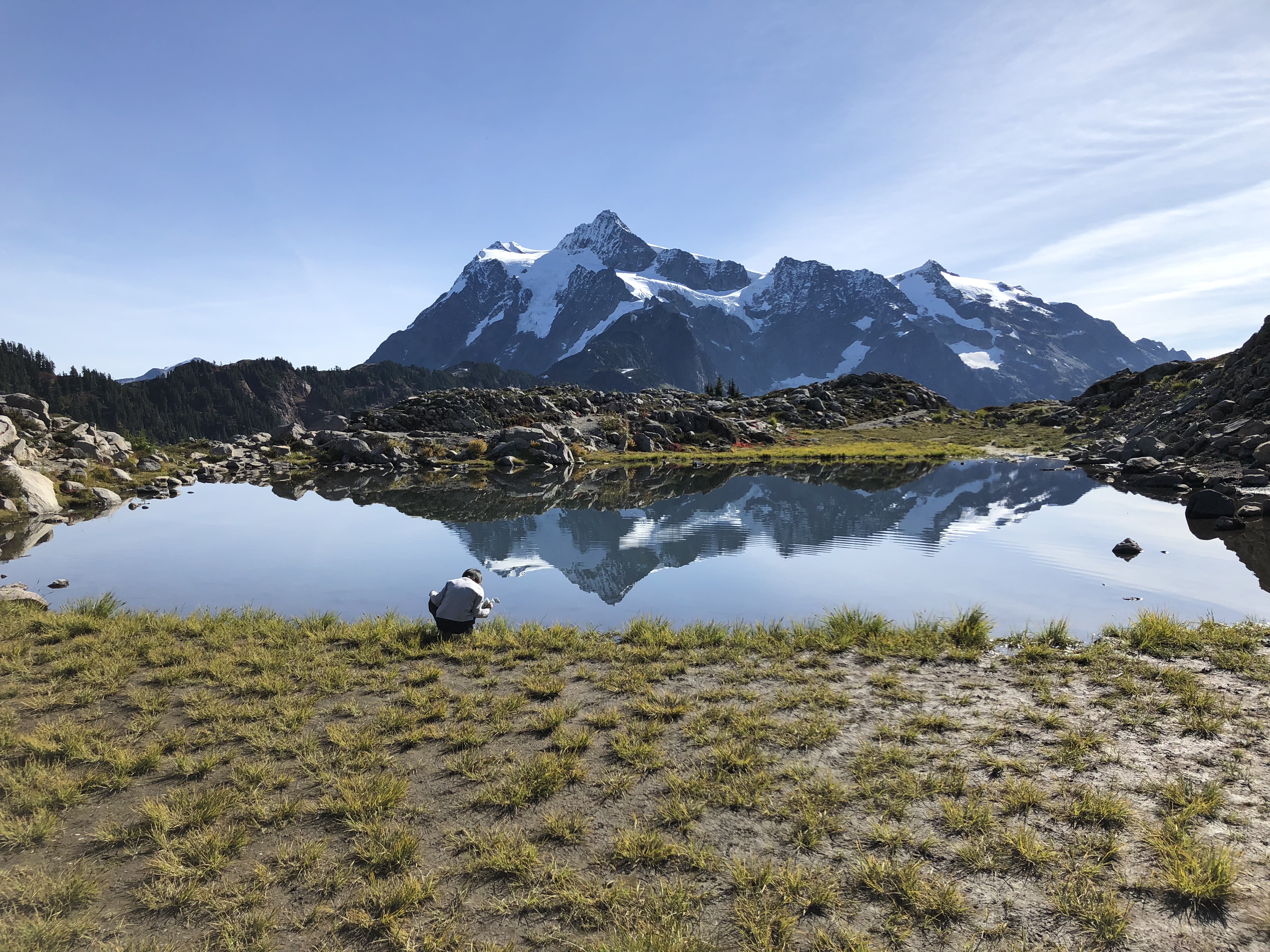 These pictures were from our 2018 late September visit, during which time the wild blueberry bushes had turned red, giving the area a nice touch of autumn. Once you enter the Heather Meadows area, the first beauty that welcomes you is Picture Lake. It is a small lake with a short, less than 1km, trail around the lake. Although small, the view at the lake is very pretty, as Mount Shuksan stands tall far in the background, and the calm waters of the lake is always painting a pretty picture via reflection. After spending some time at Picture Lake and walking the short trail around it, we drove higher up to in elevation and reached Artist Point. We hiked the Artist Ridge Trail from Artist Point. The Artist Ridge Trail is another short 2.4km out-and-back trail with about 80m elevation gain. There was a puddle of snow melted water (which I guess you can call a lake) at the end of the trail, with Mount Shuksan in direct view behind the puddle. After hiking the Artist Ridge Trail, we got back to our car and drove to the visitor center parking lot to explore the Fire and Ice Trail and also parts of the Bagley Lakes Trail. We saw the Bagley Lakes, Bagley Creek, and more beautiful views.