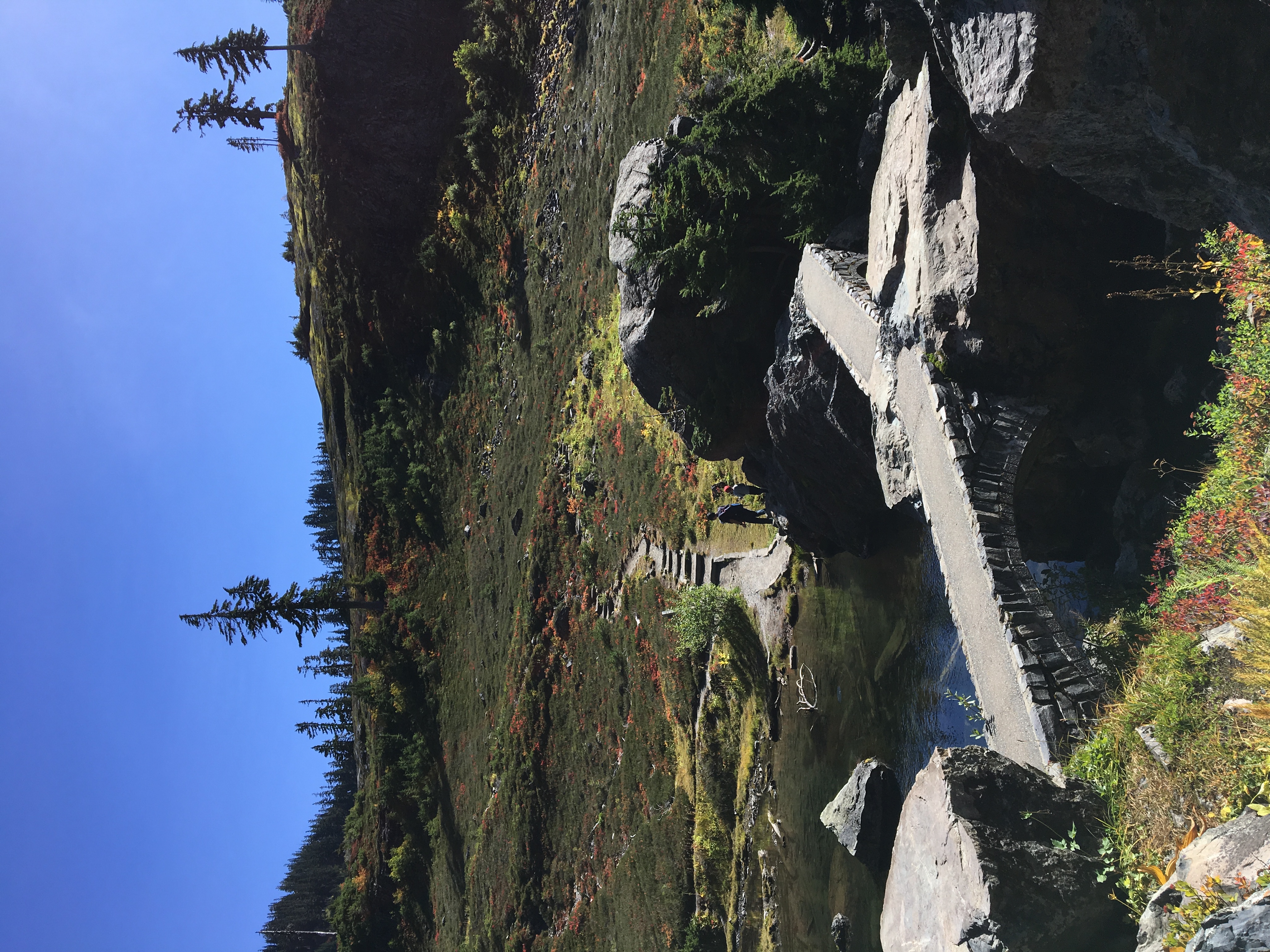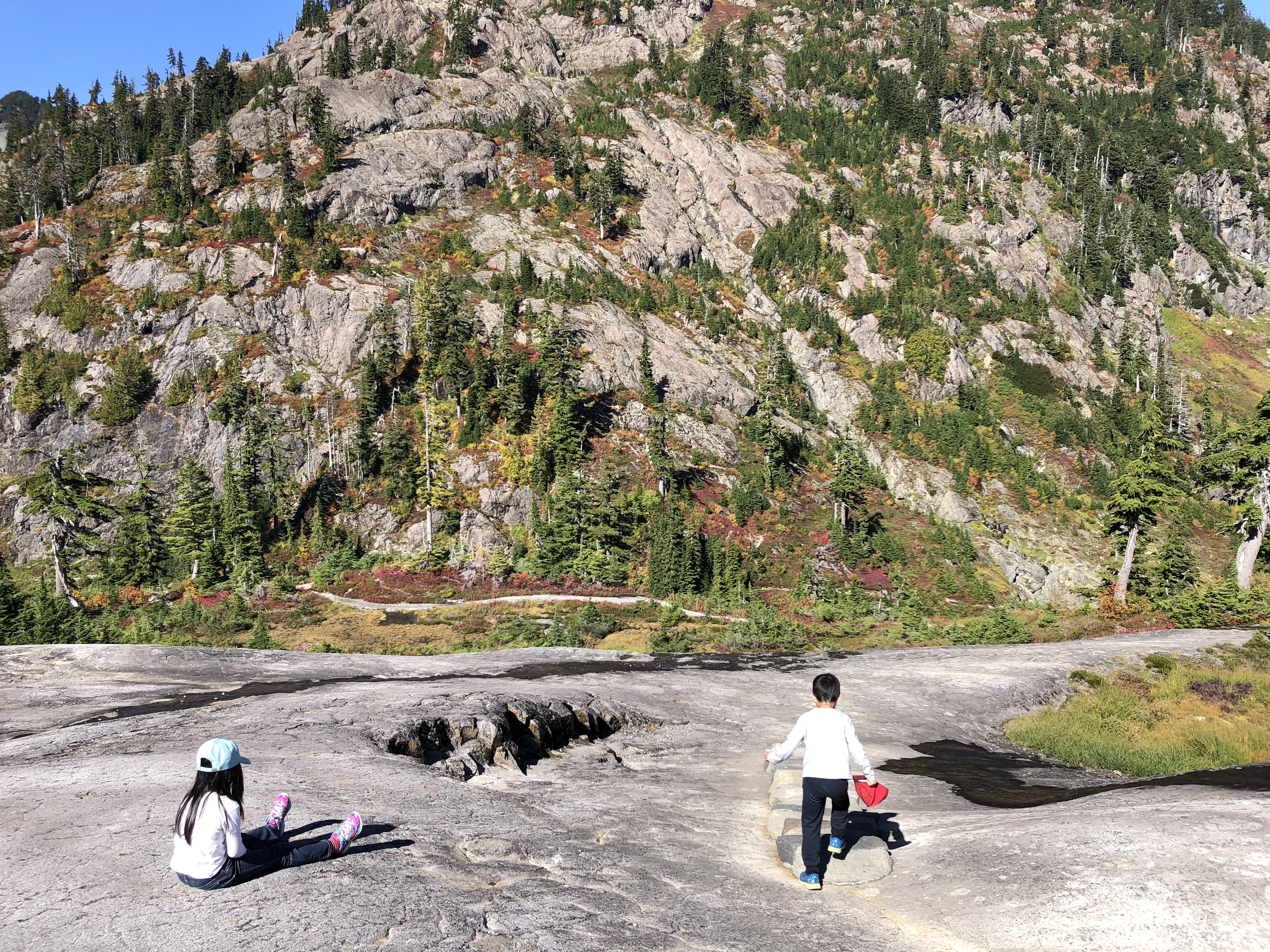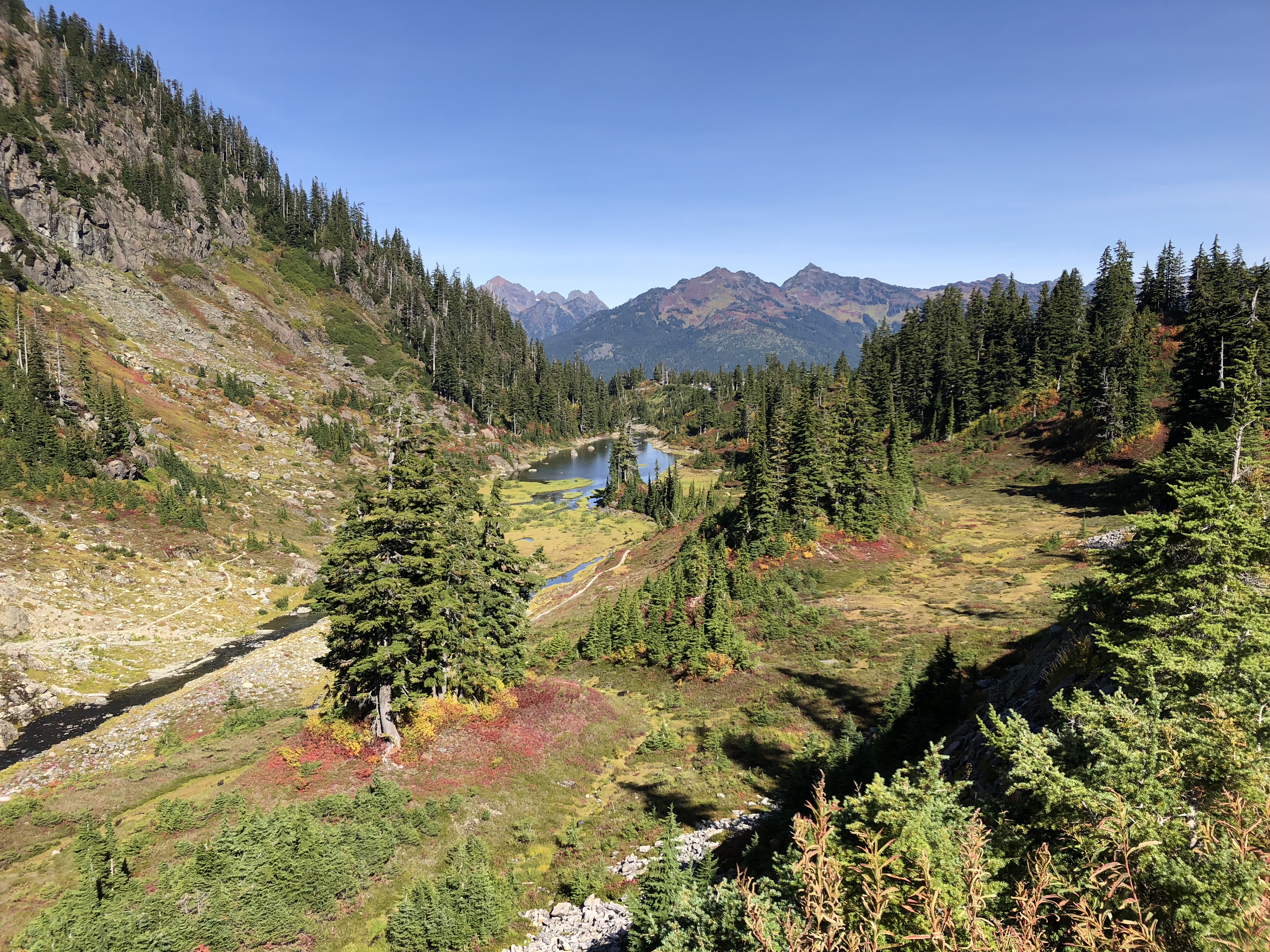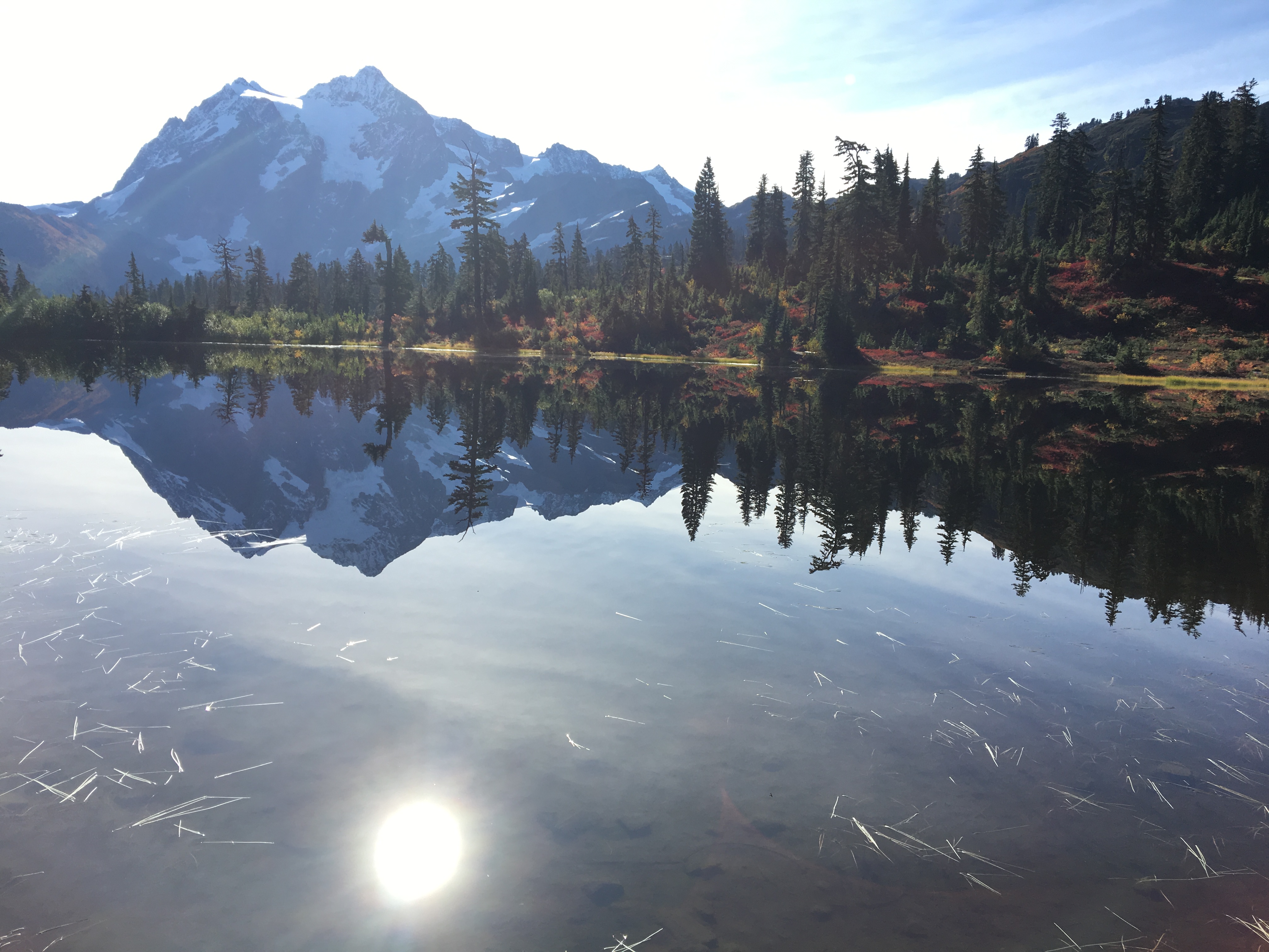 These pictures were from our 2018 late September visit, during which time the wild blueberry bushes had turned red, giving the area a nice touch of autumn. Once you enter the Heather Meadows area, the first beauty that welcomes you is Picture Lake. It is a small lake with a short, less than 1km, trail around the lake. Although small, the view at the lake is very pretty, as Mount Shuksan stands tall far in the background, and the calm waters of the lake is always painting a pretty picture via reflection. After spending some time at Picture Lake and walking the short trail around it, we drove higher up to in elevation and reached Artist Point. We hiked the Artist Ridge Trail from Artist Point. The Artist Ridge Trail is another short 2.4km out-and-back trail with about 80m elevation gain. There was a puddle of snow melted water (which I guess you can call a lake) at the end of the trail, with Mount Shuksan in direct view behind the puddle. After hiking the Artist Ridge Trail, we got back to our car and drove to the visitor center parking lot to explore the Fire and Ice Trail and also parts of the Bagley Lakes Trail. We saw the Bagley Lakes, Bagley Creek, and more beautiful views.