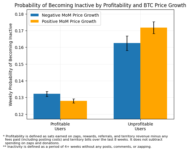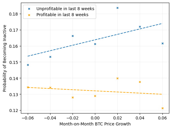 , then unprofitable users are about 4.5 percentage points more likely to become inactive than profitable users in any given week. But when monthly bitcoin price appreciation is 5\%