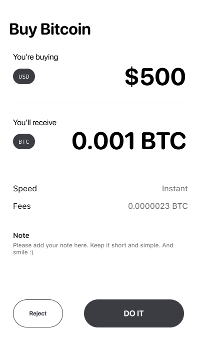 Speed and fees are visible but quiet. The note field keeps things human. The button uses every day language.