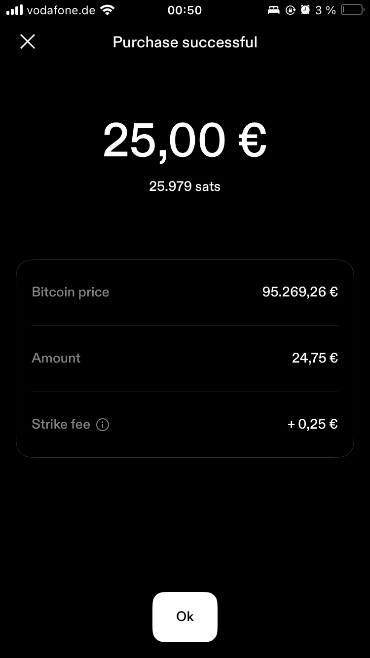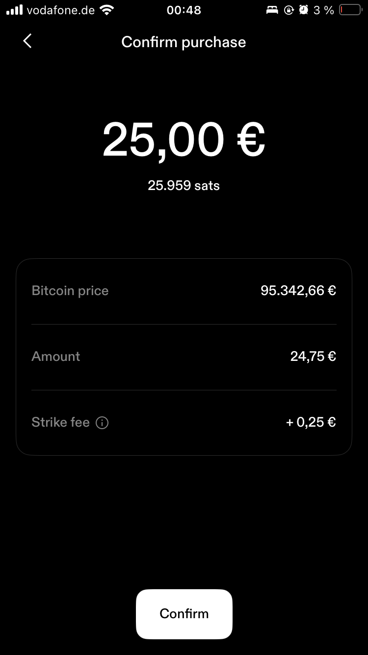 It shows I’m spending €25, I’ll receive 25,959 sats, $24.75 is converted to bitcoin and $0.25 is the fee