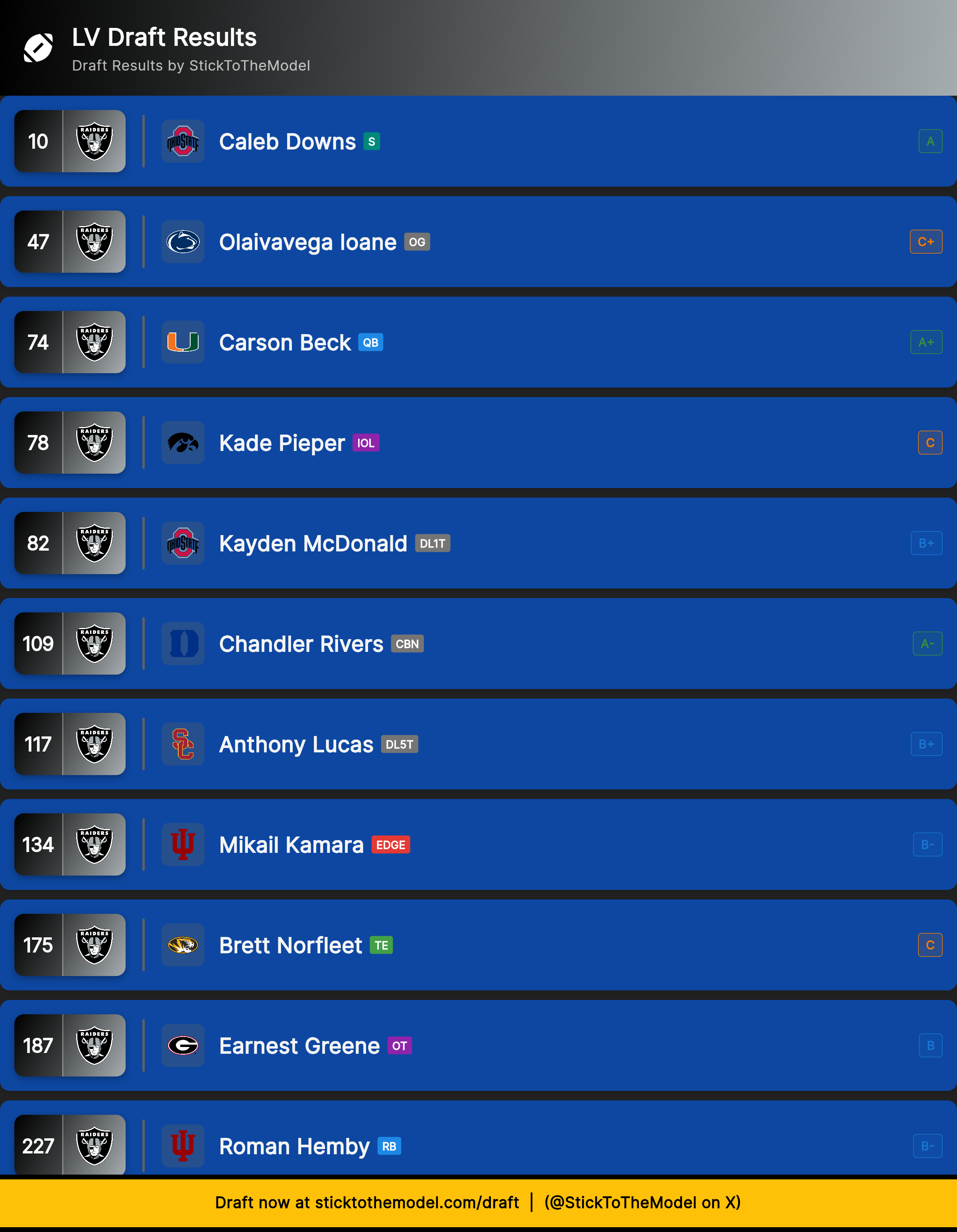 As it stands, the Raiders picked 8th but I trade back to 10th for an additional 3rd.