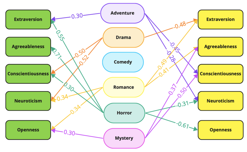 Objective: This study explores the correlation between college students' film genre preferences and their personality traits, as defined by the Big Five theory. Additionally, it seeks to evaluate the potential application of these correlations in hiring and screening processes.Method: A total of 300 college students aged 20-23 participated in the study. Participants completed a demographic survey, ranked their preferred film genres, and responded to the Big Five inventory questionnaire. Data were analyzed using correlation and regression tests to determine the relationship between film genre preferences (independent variable) and personality traits (dependent variable), with a significance level set at p < 0.05.Results: The analysis revealed significant correlations between preferred film genres and personality traits for all genres except comedy. Adventure films showed a positive correlation with extraversion but negative with conscientiousness and neuroticism. Drama correlated positively with conscientiousness and neuroticism, while romance linked to neuroticism and openness. Horror films were positively associated with extraversion and agreeableness, and mystery films correlated with openness.Conclusion: The findings suggest that college students' film genre preferences significantly correlate with their personality traits. These correlations may have implications for personality assessments in various contexts, including hiring practices. However, further research is necessary to generalize these results beyond the studied population.