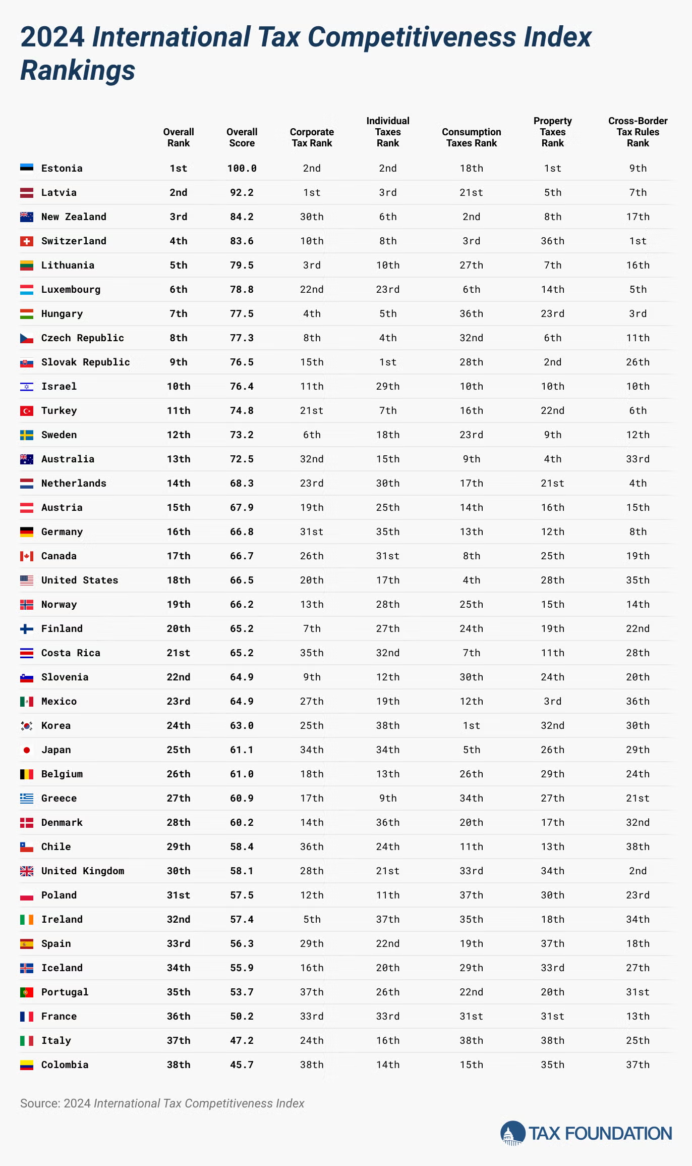 The International Tax Competitiveness Index (ITCI) seeks to measure the extent to which a country’s tax system adheres to two important aspects of tax policy: competitiveness and neutrality.A competitive tax code is one that keeps marginal tax rates low. In today’s globalized world, capital is highly mobile. Businesses can choose to invest in any number of countries throughout the world to find the highest rate of return. This means that businesses will look for countries with lower tax rates on investment to maximize their after-tax rate of return. If a country’s tax rate is too high, it will drive investment elsewhere, leading to slower economic growth. In addition, high marginal tax rates can impede domestic investment and lead to tax avoidance.2024 Rankings