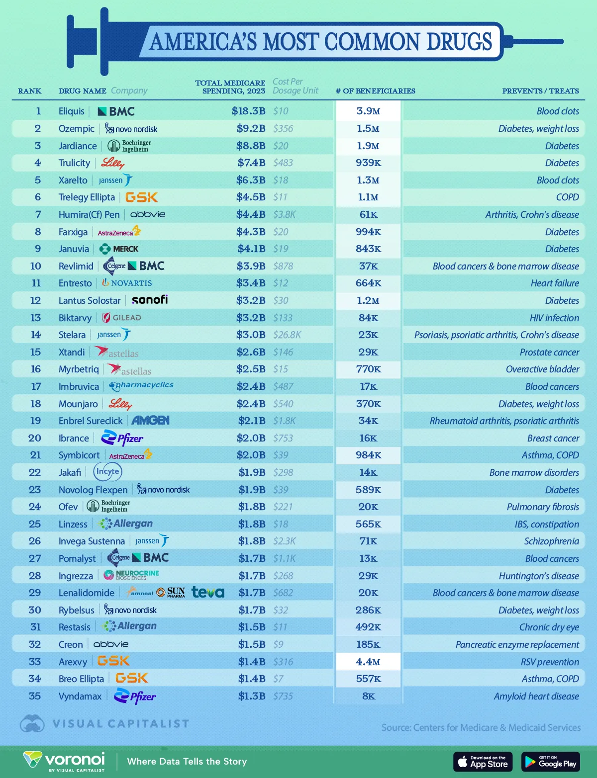 From diabetes injectables to blockbuster blood thinners, a handful of drugs account for a sizable share of Medicare’s pharmacy bill.This visualization ranks the most common drugs by total Medicare spending in 2023, sourced from Centers for Medicare & Medicaid ServicesIt tracks every claim, dosage, and dollar flowing through Medicare Part D, the federal prescription-drug benefit.