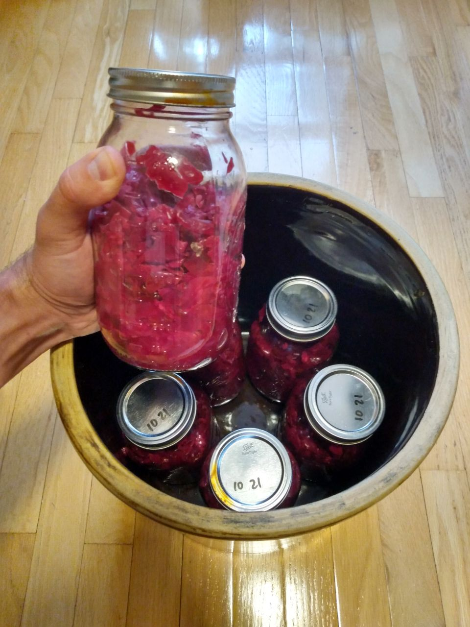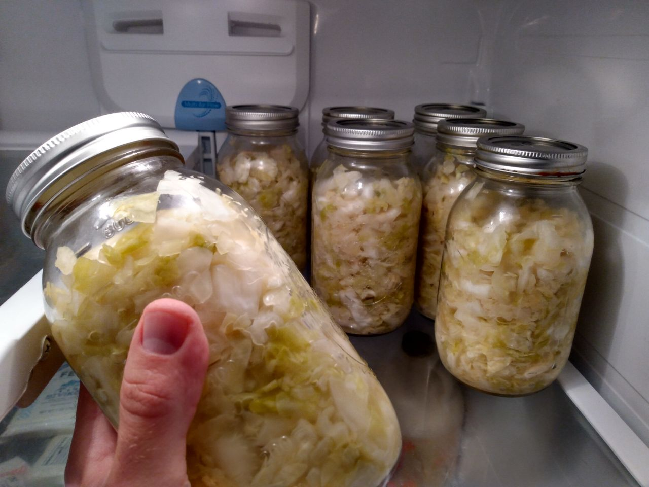 take a crock or a big bowl, slice up cabbage, and mash it up until enough juice comes out to make the plant fiber drown in its own juice; i weight it down temporarily with a kettlebell in order to release more juice; recently i started using a rock energized with sacred neodymium magnet geometry (more on that later)...