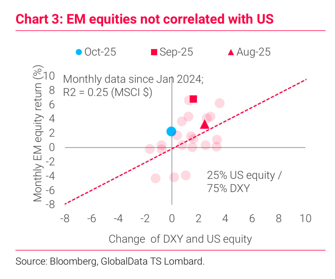 Meanwhile, emerging market assets have de-correlated with the S&P and the USD in relation to 2023, but remain vulnerable to shocks: a US recession or banking collapse would still have strong contagion, especially in FX and local debt.