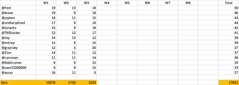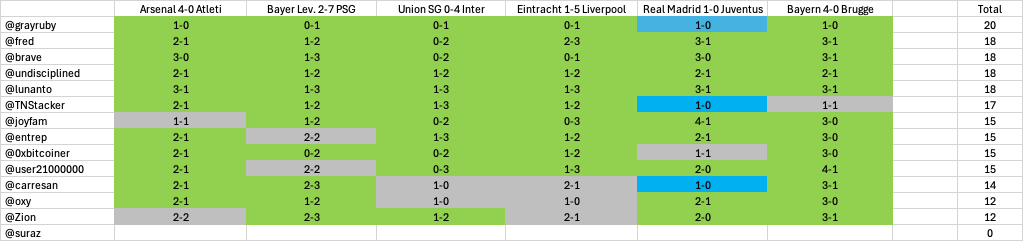 This result helped @grayruby to win this week with 20 points, ahead of a group of stackers with 18 points ( @fred , @brave , @Undisciplined and @lunanto )