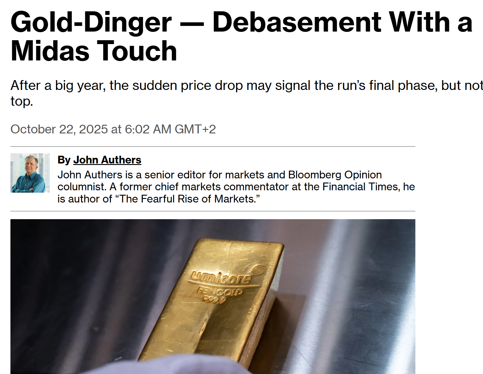 what has driven gold this year? In one word, it would appear to be “debasement.” The fear that inflation and lax money will lead to the intrinsic devaluation of the dollar and other fiat currencies has been turned of late into a “debasement trade.” It’s often said that narratives lead markets, and the dwindling dollar has become a powerful narrative.
