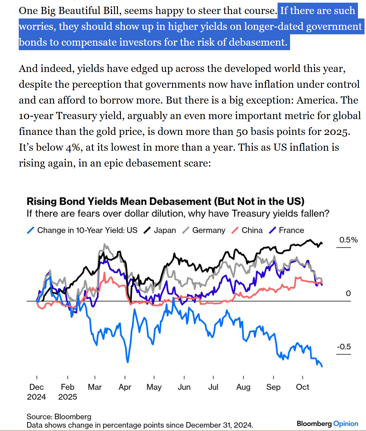 Also, nobody is afraid of debasement because, uh, look at Treasury yields!