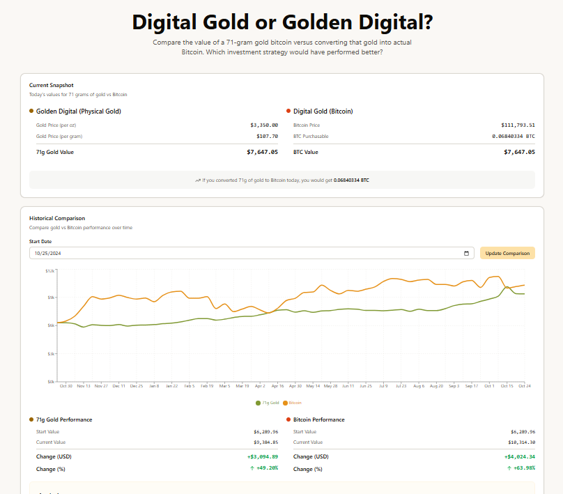 But, what if that 71 grams of gold value was used to purchase BTC? At any given moment, the swapping-around rate would all be the same: gold value, BTC value, USD value. But, over time, which investment wins? In other words, would you be better off holding the 71 grams of physical gold as a tangible coin or holding that amount of BTC as "golden digital"?