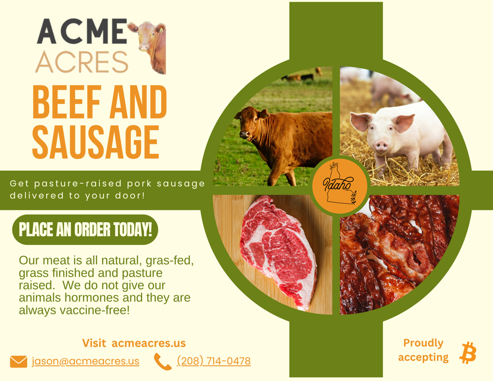 Grass fed , grass finished beef and pasture raised pork! Raised in Spirit Lake, Idaho! Proudly accepting bitcoin. Delivery to your door! Stop eating fiat food!