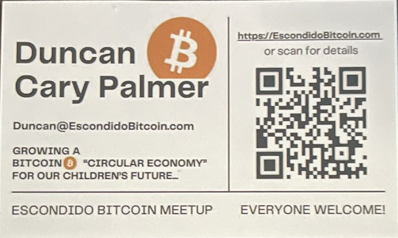 overall, wonderful meetup. It's so refreshing for me to have conversations with bitcoiners where we can talk and share our different viewpoints of the world under one unifying idea of what money should be. In any bitcoin gathering you'll find plenty of diversity in religion, lifestyle, politics, tech expertise, but everyone agrees that money should be free of debasement, agnostic to those opinions, and unseasonable. It feels really good to just converse with bitcoiners for a change instead of explaining this "radical" idea to the uncaring friends, family, or peers in my life. Which I seldom do these days. Keep you eyes on San Diego, bitcoin adoption is starting to simmer here. I foresee a roaring boil in the future and Duncan is a burning heat source. He is actively taking steps to build the world he wants to see, it's awesome and motivating to see and be a part of.