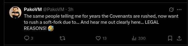 Limit (new) scriptPubKeys to 83 bytes or less. 34 doesn't seem terrible. UTXOs are a huge cost to nodes, we should always keep them as small as possible. Anything else can be hashed (if SHA256 is broken, we need a hardfork anyway). Limit script data pushes to 256 bytes, with an exception for BIP16 redeem scripts. Make undefined witness/taproot versions invalid, including the annex and OP_SUCCESS*. To make any legitimate usage of them, we need a softfork anyway (see below about expiring this). Limit taproot control block to 257 bytes (128 scripts max), or at least way less than it currently is. 340e36 scripts is completely unrealistic. Make OP_IF invalid inside Tapscript. It should be unnecessary with taproot, and has only(?) seen abuse.