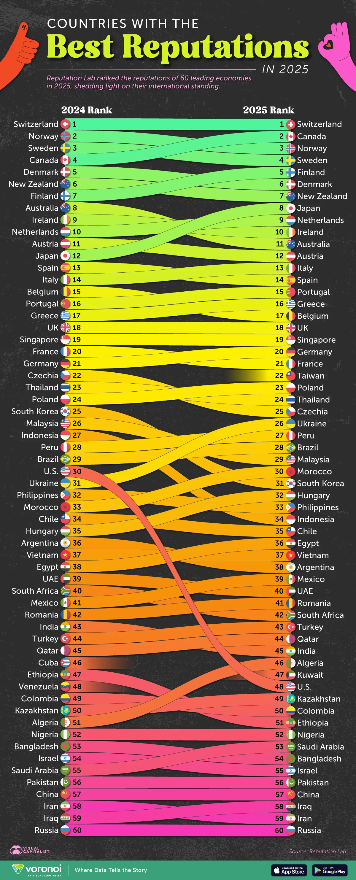 The data for this visualization comes from Reputation Lab’s RepCore Nations 2025 study.They asked citizens across the G7 (Canada, France, Germany, Italy, Japan, the U.K., and the U.S.) to rate other nations on reputational factors such as trust, admiration, respect, and overall image.