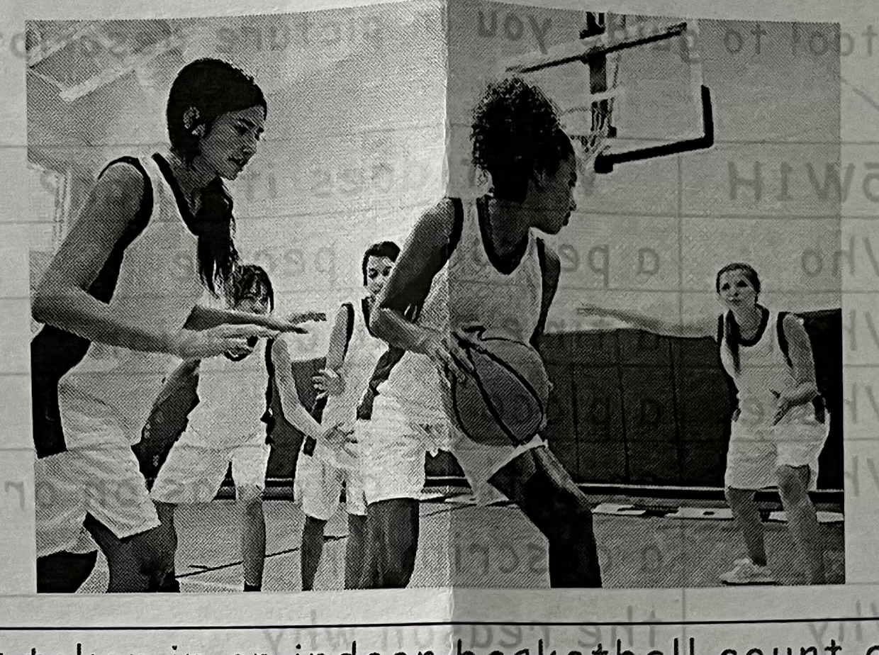 This picture is taken in an indoor basketball court as I can see the basketball hoop and ceiling in the background.