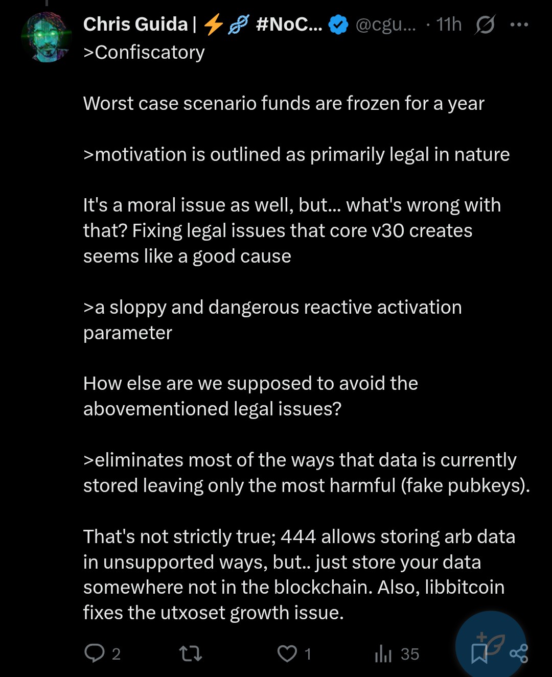 Chris exhibits similar attitudes. If you are serious about Bitcoin as money, you need to be extremely careful that you don't arbitrarily violate people's ability to use it as money.