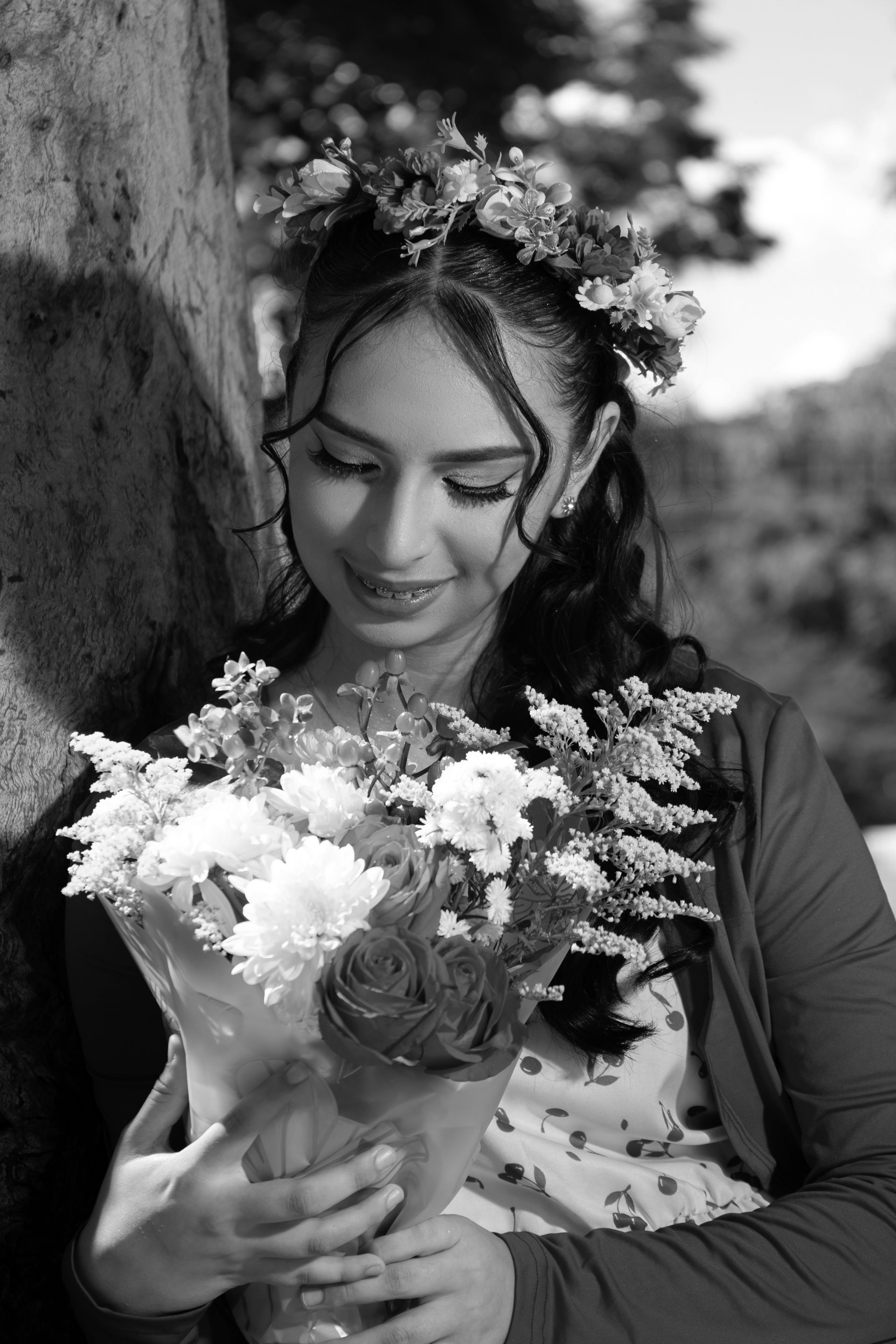 We took the photographs in a park because the girl wanted them to be outdoors since she loves nature. For that reason, we started the first photographs in a very beautiful way, with a bouquet of flowers: