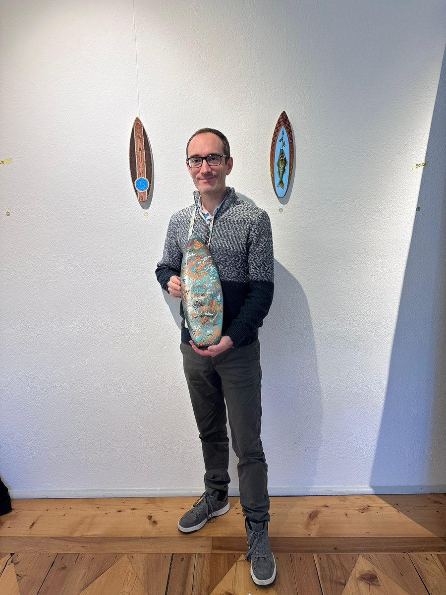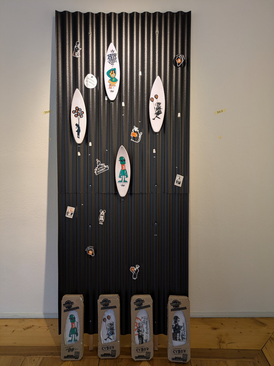 - I interviewed Daniel from https://www.fairdeeds.com His company supports circular economy in developing countries. He buys product from them and pay them in sats. Keychain and mini surf board, upcycling from used board that the kids cannot surf on it anymore with Bitcoin related backstreet art from StreetCyber from Barcelona.