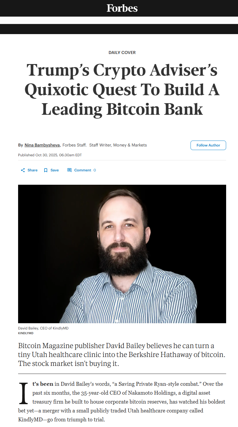 "Bitcoin Magazine publisher David Bailey believes he can turn a tiny Utah healthcare clinic into the Berkshire Hathaway of bitcoin. The stock market isn’t buying it"